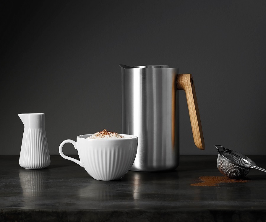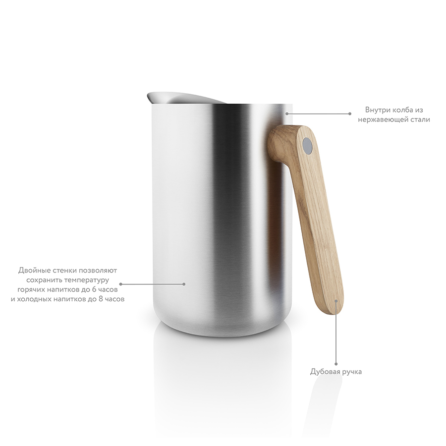 Минималистичный дизайн и высокая функциональность составляют суть скандинавского стиля. Коллекция предметов сервировки Nordic kitchen воплотила все черты северной эстетики. В модели гармонично сочетается эргономичность форм, металлический цвет и древесная фактура. Термокувшин с корпусом из нержавеющей стали и ручкой из натурального дуба идеально подходит для сервировки стола. Изогнутый носик специально разработан, чтобы жидкость не расплёскивалась при наливании. Внутри термокувшина - стальная колба. Крышка плотно закрывается, чтобы чай или кофе максимально долго сохраняли свою температуру.