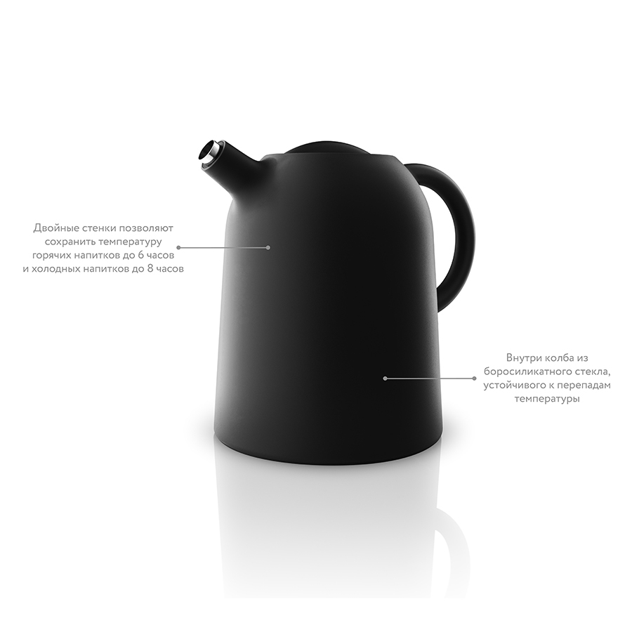 При оформлении посуды дизайнеры отдали предпочтение форме традиционного чайника. В течение 6 часов термокувшин сохранит температуру вашего напитка, будь это холодный фруктовый чай или горячий кофе. Внутри пластикового корпуса расположена колба, выполненная из жаропрочного стекла. Стальная вставка в горлышке не даст пролиться ни одной лишней капли, благодаря запатентованной функции drip-free. Удобная крышка плотно закрывает кувшин. Просто поверните ее на 180°, чтобы наполнить емкость напитком. Объем – 1 л.