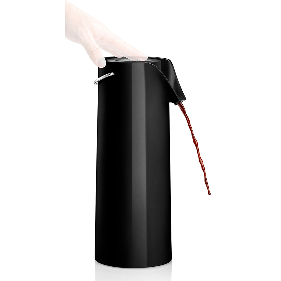 Термос с помпой от Eva Solo идеален для пикника, отдыха на открытом воздухе или встреч, где участникам время от времени требуется горячий или холодный напиток. Термос имеет практичную рукоятку, благодаря которой легко переносится. Он может вращаться на 360 градусов на своём основании, что позволяет всем за столом самим наливать себе кофе, для чего не надо переставлять или поднимать термос. Помпа рассчитана на минимум 30000 нажатий. Внешний корпус сделан из пластика, внутри колба из стекла. Объём 1,8 л.