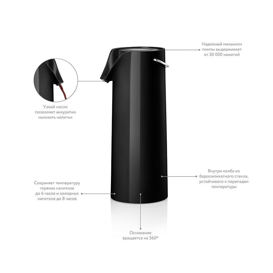 Термос имеет практичную рукоятку, благодаря которой легко переносится. Он может вращаться на 360 градусов на своем основании, что позволяет всем за столом самим наливать себе кофе, не переставляя термос. Помпа рассчитана на минимум 30000 нажатий. Внешний корпус сделан из пластика, внутри расположена колба из стекла. Объем 1,8 л.