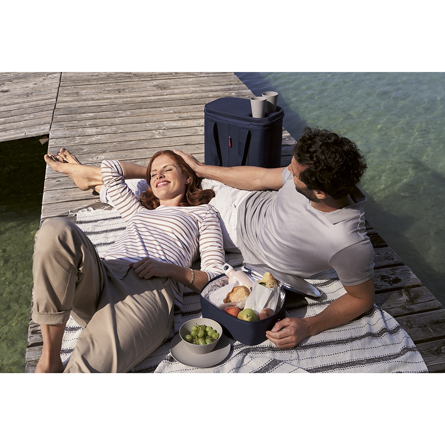 На крышке расположены удобные выемки для напитков. Внутри – термоизоляционный материал, который сохранит продукты в прохладе. Крышка закрывается очень плотно и застегивается на молнию. Тепловая изоляция выполнена из высококачественной алюминиевой фольги. Сумка оборудована удобными ручками для переноски. Материал – прочный водоотталкивающий полиэстер, выполненный из переработанного пластика PET. Объем – 30 л.