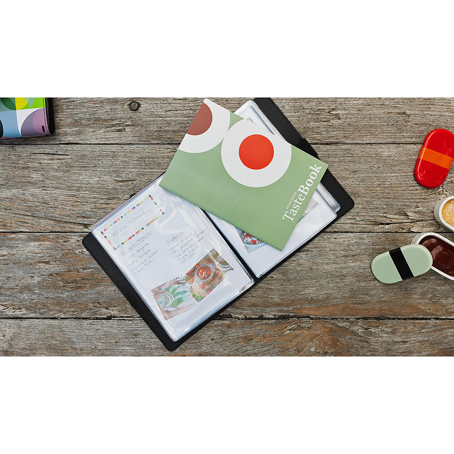 Блокнот имеет кожаный переплет, 32 прозрачные секции для хранения вырезок разных размеров, место для 100 рукописных рецептов и 42 стикера.