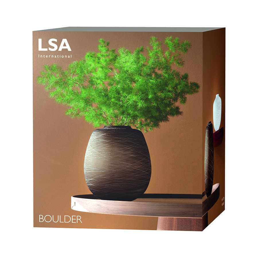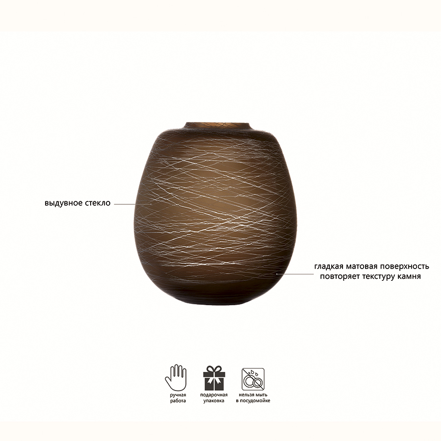 Ваза Boulder из выдувного стекла подойдет для букетов из живых и искусственных цветов, а также для высушенных трав и других композиций. Оригинальная форма и гладкая матовая поверхность повторяет текстуру камня. Завершают оформление нитевидные узоры, изящно обернутые вокруг вазы. Аксессуар упакован в красивую коробку и станет отличным подарком на юбилей, свадьбу и другое торжество. Мелкие пузырьки внутри выдувного стекла не являются браком (круглые пузырьки < 3 мм и овальные пузырьки < 5 мм): это допустимые индивидуальные особенности изделий, изготовленных вручную. Рекомендуемый уход: ручная мойка, протирать насухо мягкой тканью