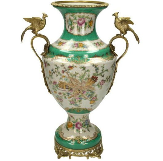 Ваза с птицами выполнена в классическом стиле, имеет две декоративные ручки по бокам и резную подставку-основание. Орнамент в виде птиц и цветов, словно приковывает взгляд. Двусторонняя.