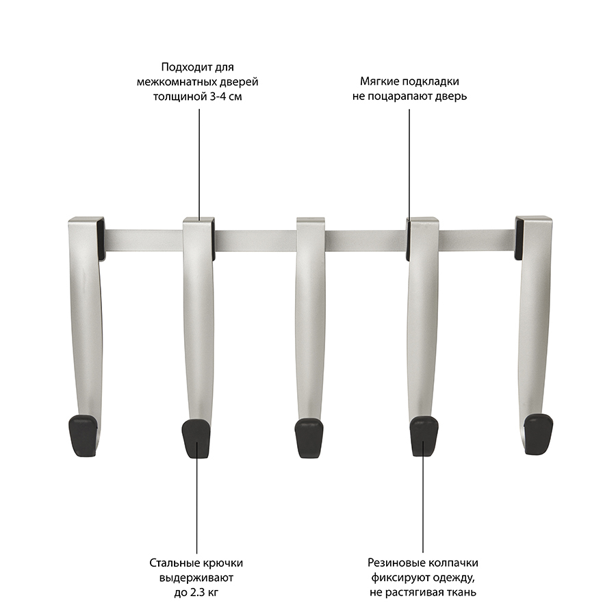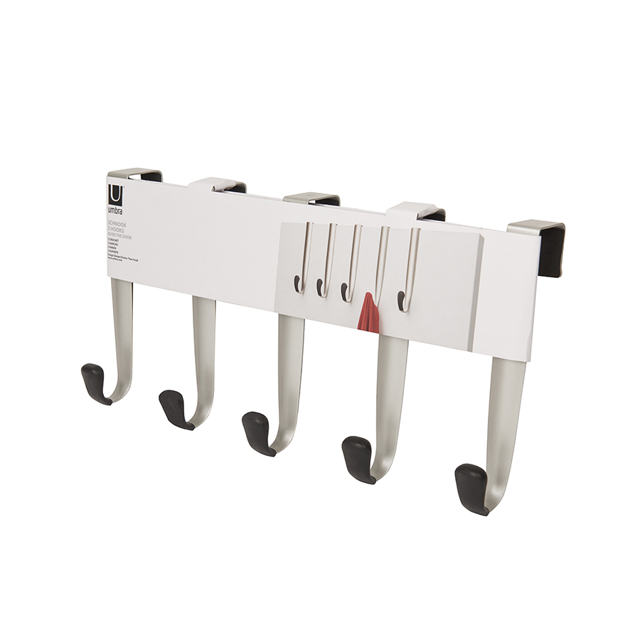 Надверная вешалка Schnook 5 крючков идеально дополнит интерьер кухни, прихожей или ванной комнаты. Аксессуар торговой марки Umbra выполнен из штампованного металла высокого качества. Благодаря никелевому покрытию изделие не поддается ржавлению и сохраняет привлекательный вид на протяжении всего срока эксплуатации. Автором идеи создания многофункциональной вешалки для дома стал талантливый дизайнер Thea Yuzyk. Изделие легко крепится к дверям без использования клея и дюбелей. Специальная накладка препятствует скольжению вешалки по поверхности. Аксессуар имеет пять крючков с резиновыми наконечниками, защищающими одежду от повреждений. Материал: металл. Размеры: 43х21,2х9,5 см.