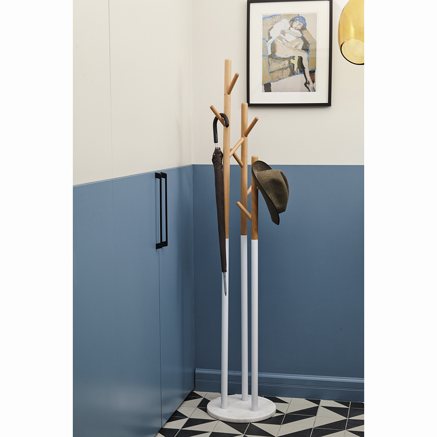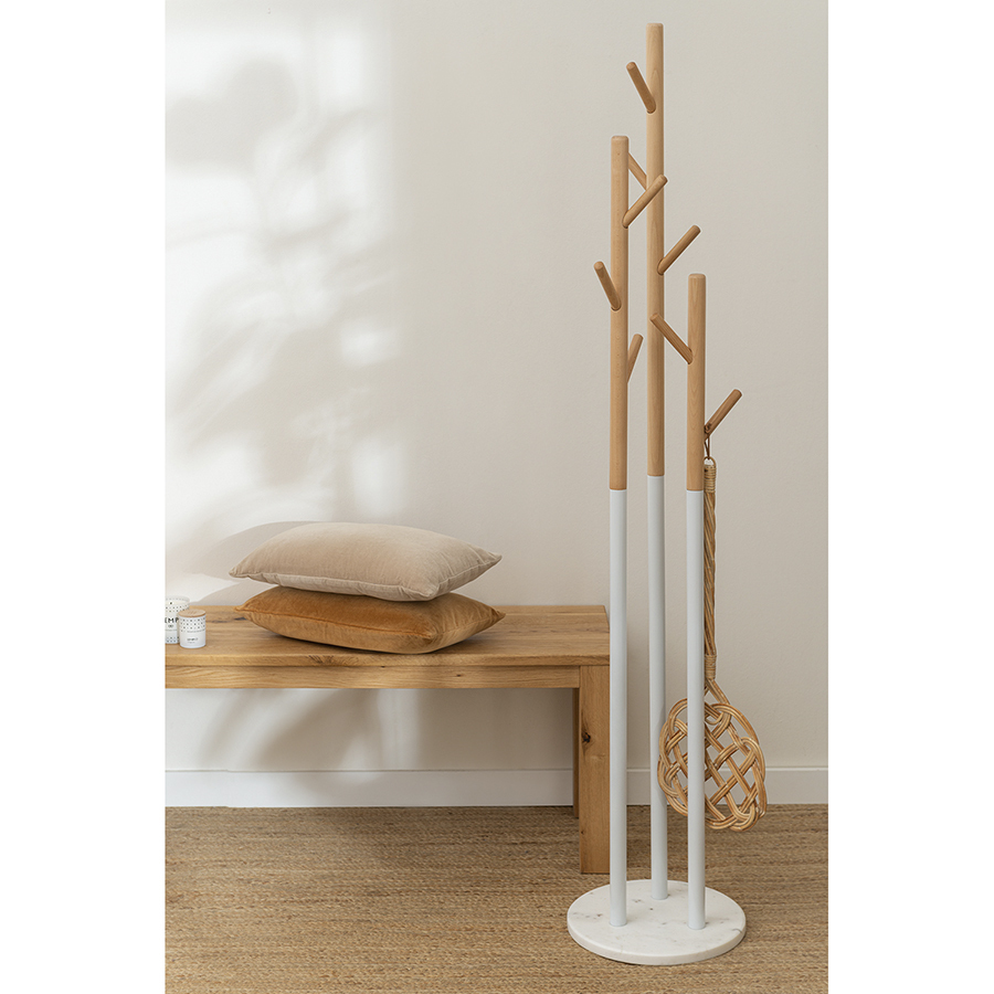 Напольная вешалка Solheim станет стильным акцентом в интерьере дома или офиса. Элементы из металла, дерева и натурального мрамора великолепно дополняют друг друга и органично сочетаются с декором из любых материалов. Расположенные на разной высоте крючки позволяют удобно разместить верхнюю одежду и аксессуары. Модель отлично подходит для оформления прихожей с современным, минималистичным и эклектичным дизайном. Каждый крючок выдерживает нагрузку до 5 кг, а вешалка в целом – не более 20 кг.