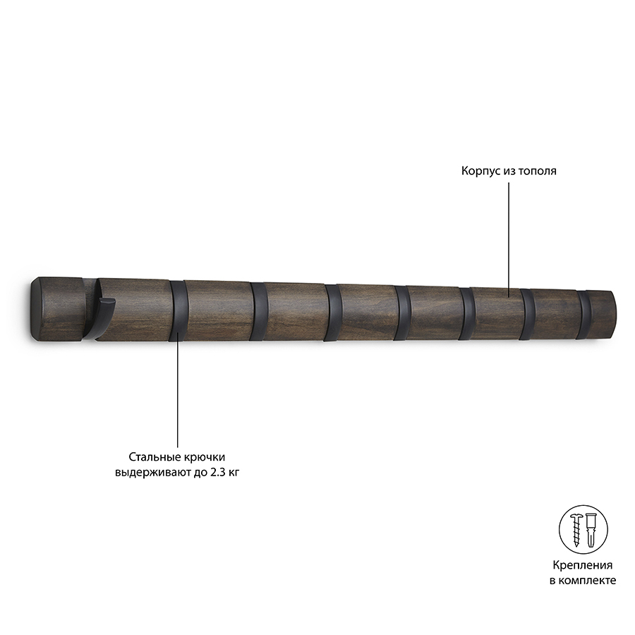 Вешалка имеет 8 откидных крючов из никеля: когда они не используются, их можно легко сложить. Каждый крючок выдерживает вес до 2,3 кг. Поставляется с подробной инструкцией по установке и необходимым монтажным оборудованием.