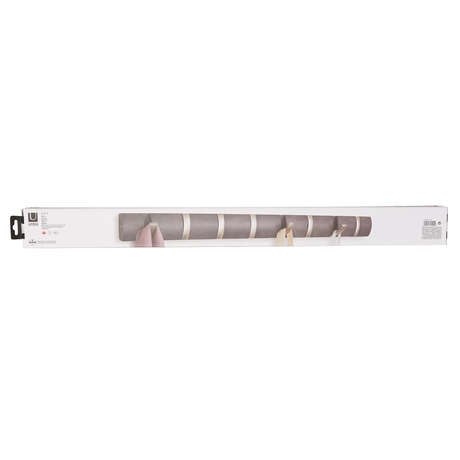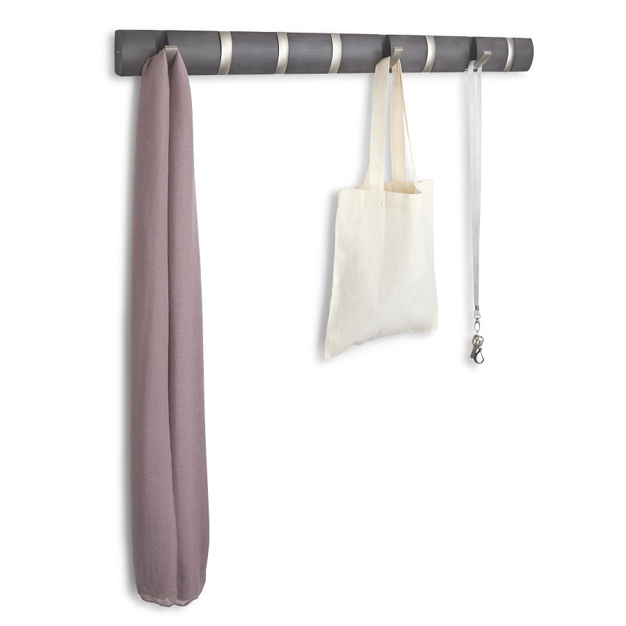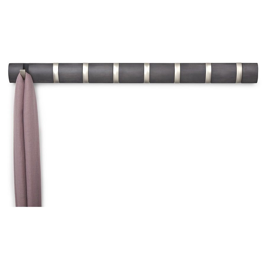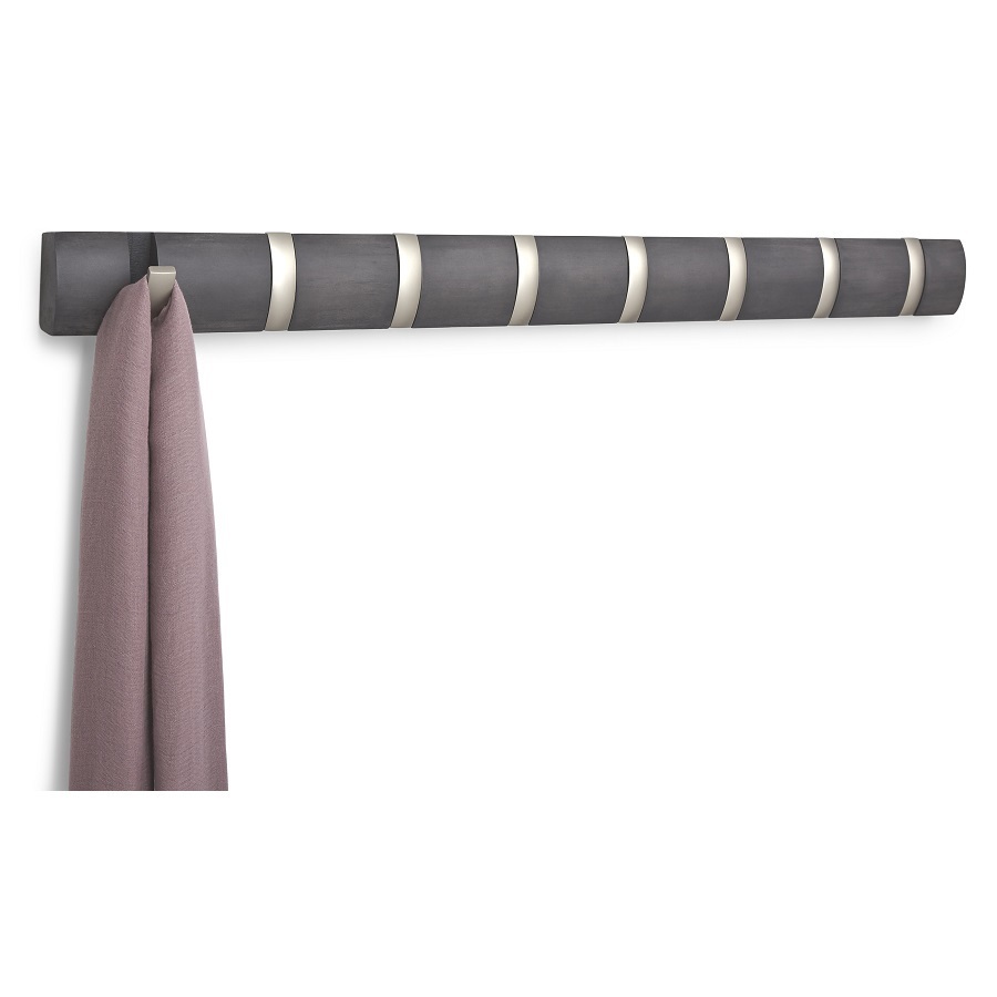 Настенная вешалка Flip станет изысканным украшением современного или классического интерьера дома. Особенность модели – это идеальное сочетание оригинального дизайна и компактных форм. Конструкция имеет 8 выдвижных крючков, именно поэтому вешалка отлично подойдет для небольших помещений. Мебель для прихожей снабжена гладким профилем и скрытой крепежной панелью, благодаря которой она без проблем монтируется на любой стене. Вешалка канадского бренда Umbra выполнена из высококачественной древесины, устойчивой к высоким нагрузкам и воздействию ультрафиолетовых лучей. К основанию изделия прикреплены прочные крючки, которые выдерживают нагрузку до 2,3 кг. Вешалка подойдет для хранения верхней одежды, сумок, зонтов и прочих аксессуаров всей семьи. Материал: дерево, металл. Размер: 81,5х6,7х4 см.