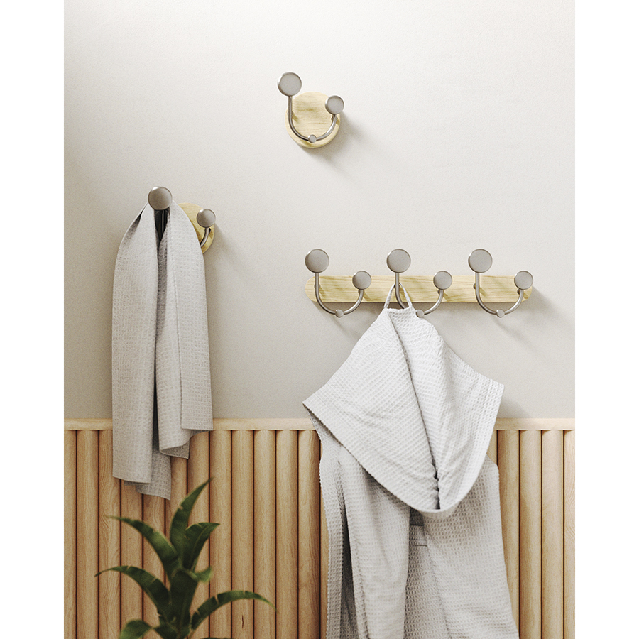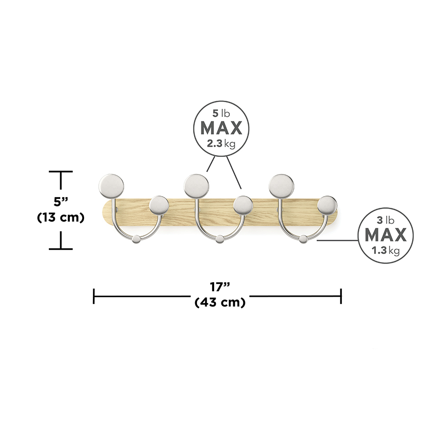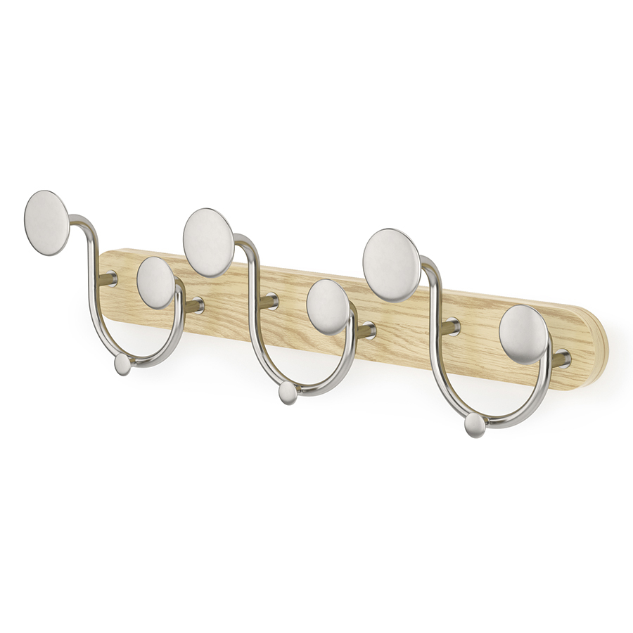 Материалы: алюминий, каучуковое дерево, ясень. Размеры: 43х8х13 см. Максимальная нагрузка на 1 крючок: 2,3 кг. Цвет: натуральное дерево/никель.