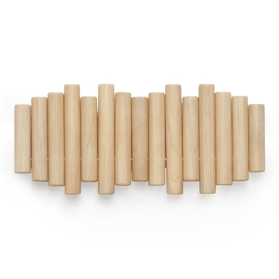 Вешалка состоит из сосновых колышков разных размеров. Аксессуар снабжен 5 складными крючками, которые способны выдерживать вес до 2,25 кг. Вешалка поставляется с набором крепежа.