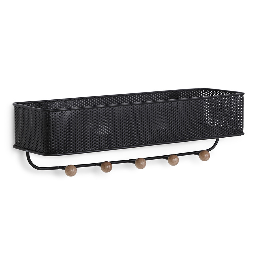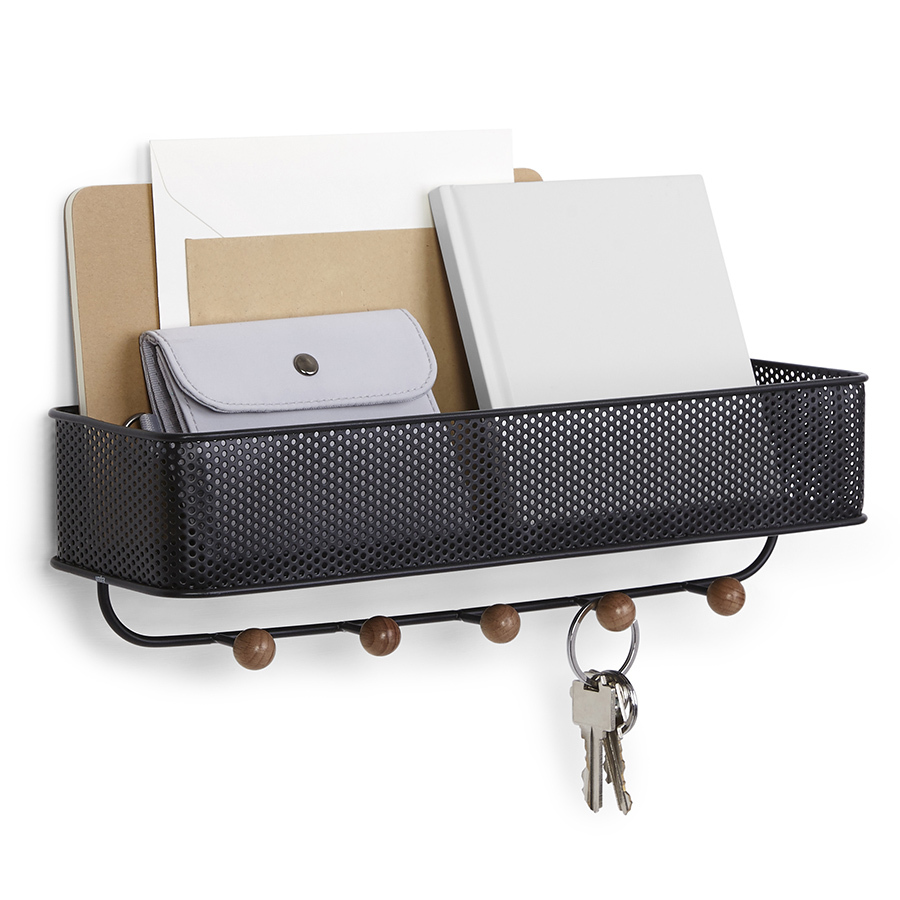 Настенный органайзер выполнен из перфорированного металла и натуральной древесины бука. Каждый крючок выдерживает нагрузку до 2,3 кг. В комплект поставки входит крепеж, что делает установку простой и быстрой.