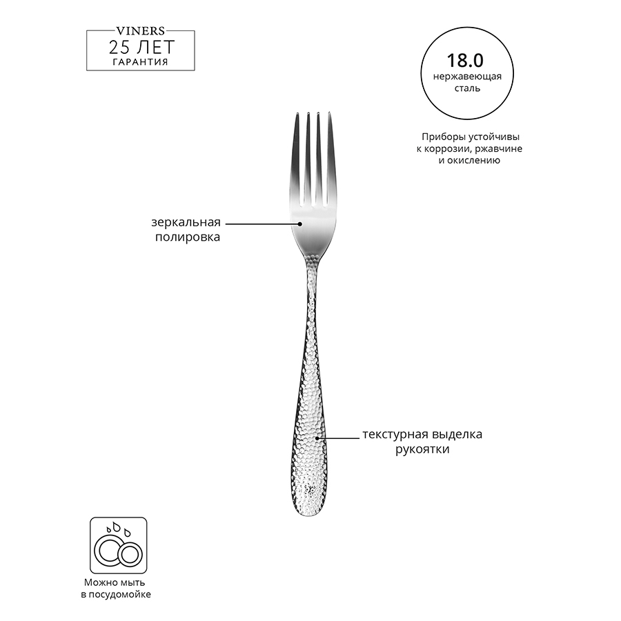 Glamour — коллекция столовых приборов из нержавеющей стали 18.00, которая производится по самым высоким стандартам качества. Текстурная выделка рукояток и зеркальная полировка делает эту коллекцию воплощениемм гламура и шика. Приборы устойчивы к коррозии, ржавчине и окислению. Бренд Viners даёт гарантию на коллекцию 25 лет.