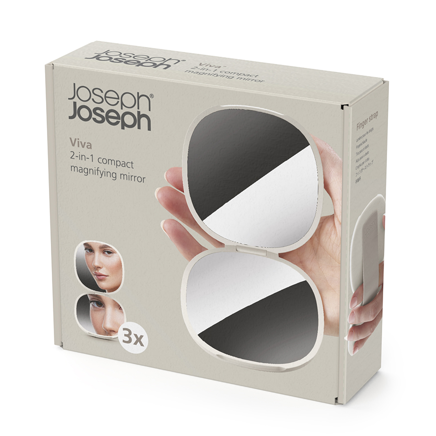Одно зеркало дает отражение в натуральную величину, второе – обеспечивает троекратное увеличение, что удобно во время нанесения помады или туши. Аксессуар удобно держать в руке благодаря мягкому силиконовому ремешку, который также служит для хранения небольших предметов косметики, таких как карандаш для глаз или блеск для губ. Магнитный замок удерживает зеркало в закрытом состоянии.