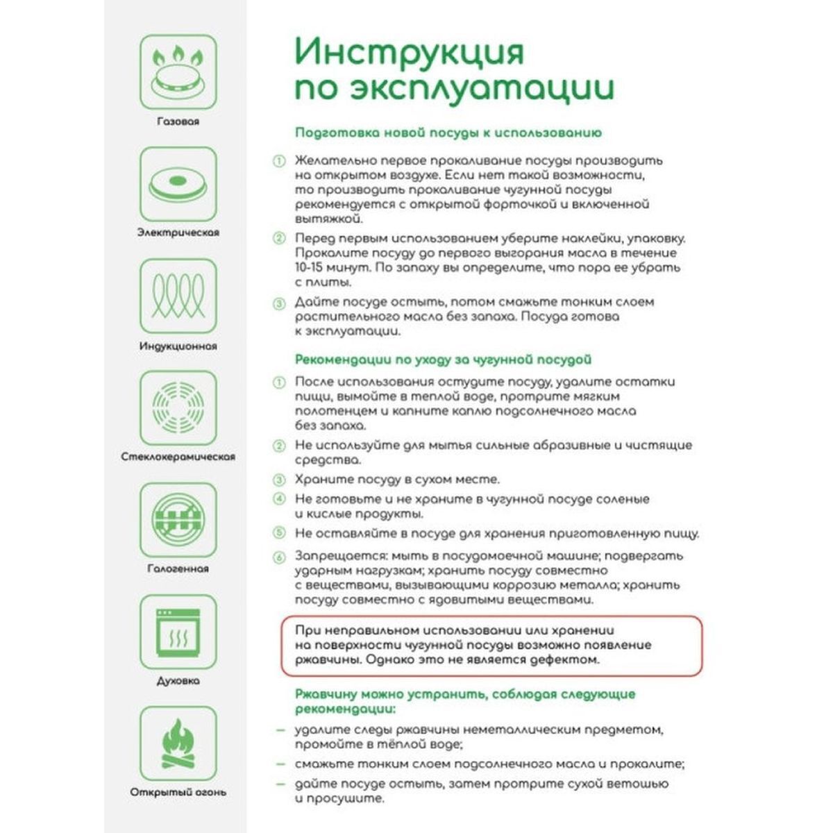 При появлении следов ржавчины : удалите следы ржавчины (не металлическим предметом), промойте в теплой воде, смажьте тонким слоем подсолнечного масла и прокалите, после остывания протрите сухой ветошью и просушите. При выполнении данной операции необходимо обеспечить достаточную вентиляцию помещения. Запрещается мыть в посудомоечной машине, подвергать ударным нагрузкам, хранить посуду совместно с веществами, вызывающими коррозию металла, хранить посуду совместно с ядовитыми веществами.