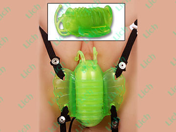 Клиторальный стимулятор *Бабочка* на эластичных ремешках для крепления к телу. Бабочка выполнена из силикона зеленого цвета, ее размеры: длина тела 5 см, размах крылышек 4,5 см.. Вибрация может плавно изменяться благодаря выносным пульту управления вибрацией. Доставит удовольствия Вашему клитору и Вам. Для пульта требуется две батарейки АА.