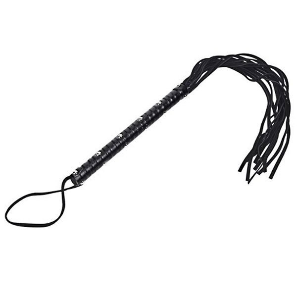 Строгая плеть с замшевыми хвостами черного цвета. На рукояти металлические серебристые заклепки, а также замшевая петля для удобства использования. Десять шнуров длиной 37 см и шириной 7 мм каждый.
