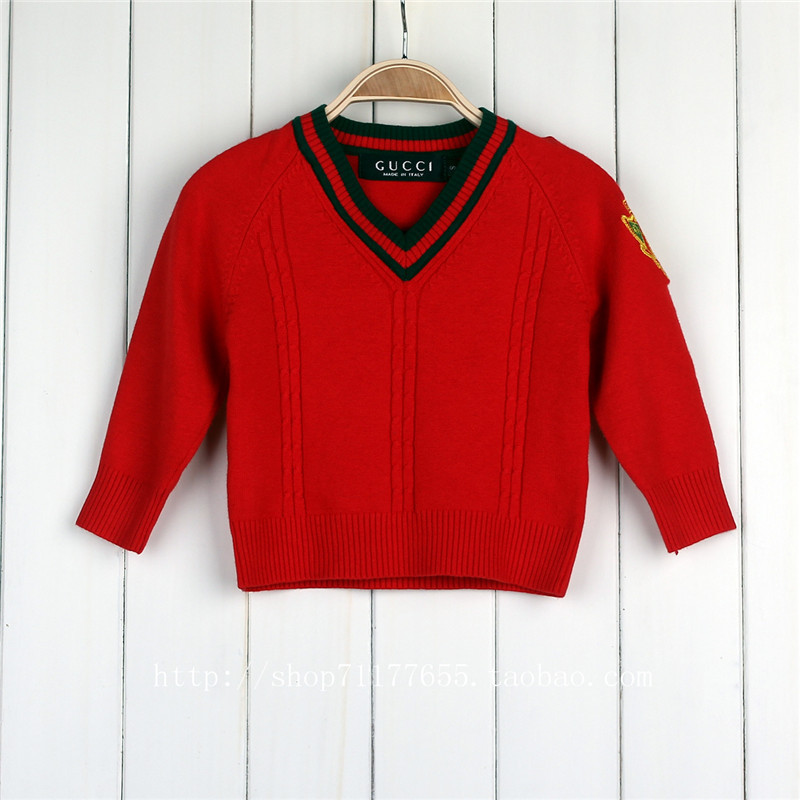 Пуловер детский с контрастным вырезом и вышивкой на рукаве
