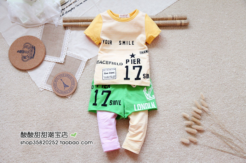 Комплект: футболка в полоску с принтами и двухслойные шорты-брюки