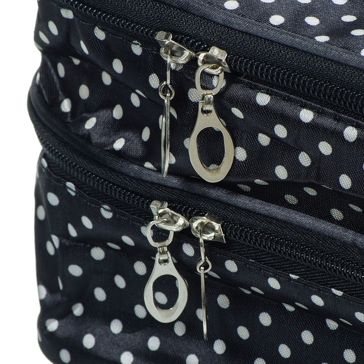 Двухярусная атласная косметичка-сундучок навсегда решит проблему хранения и транспортировки косметики и других аксессуаров для девушек. Косметичка имеет 2 отдела на молнии, внутри есть небольшое зеркальце и карманы для хранения кистей.
