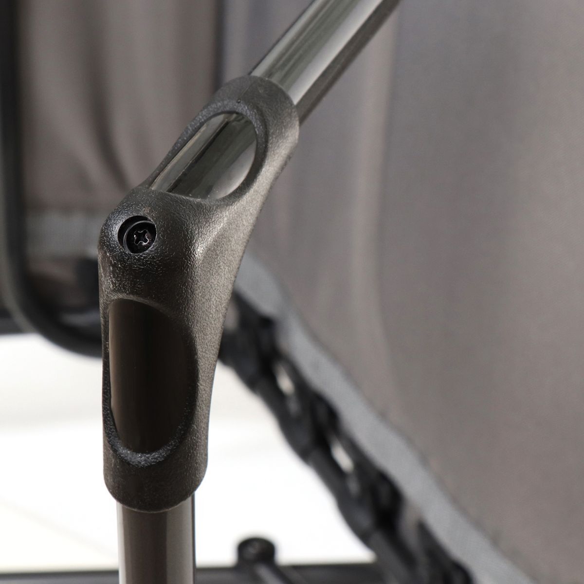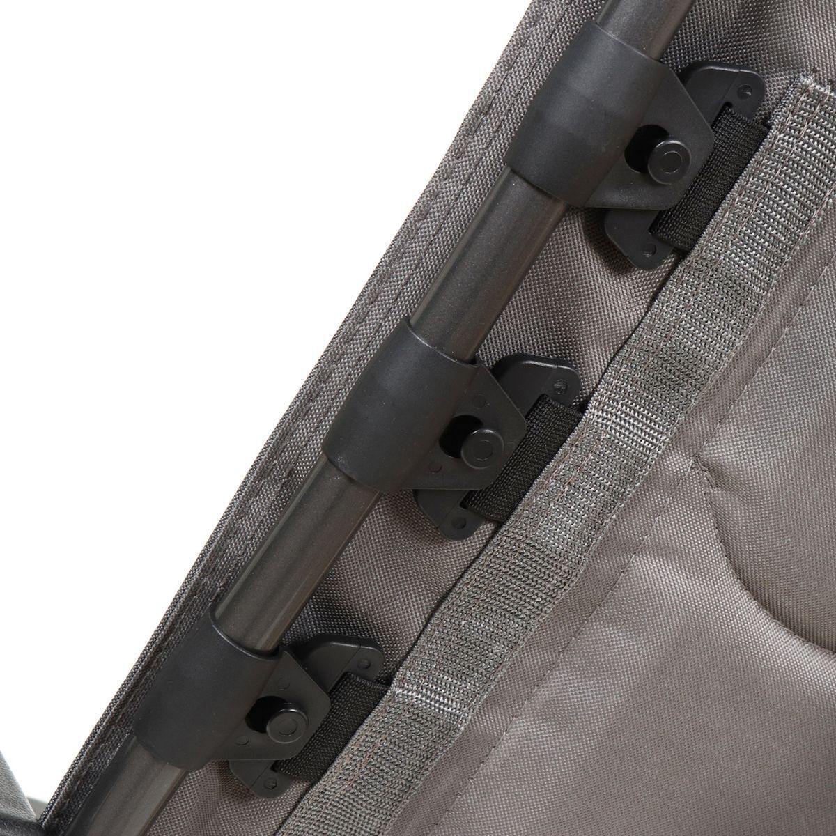Обивка спинки и сиденья из прочной устойчивой к выцветанию синтетической ткани. Ткань надежно соединяется с каркасом. Высококачественная широкая рама, выполненная из металла, добавляет ощущение безопасности и дополнительного комфорта. Металлическая рама обеспечивает надежность конструкции, лежак выдерживает до 120 кг.