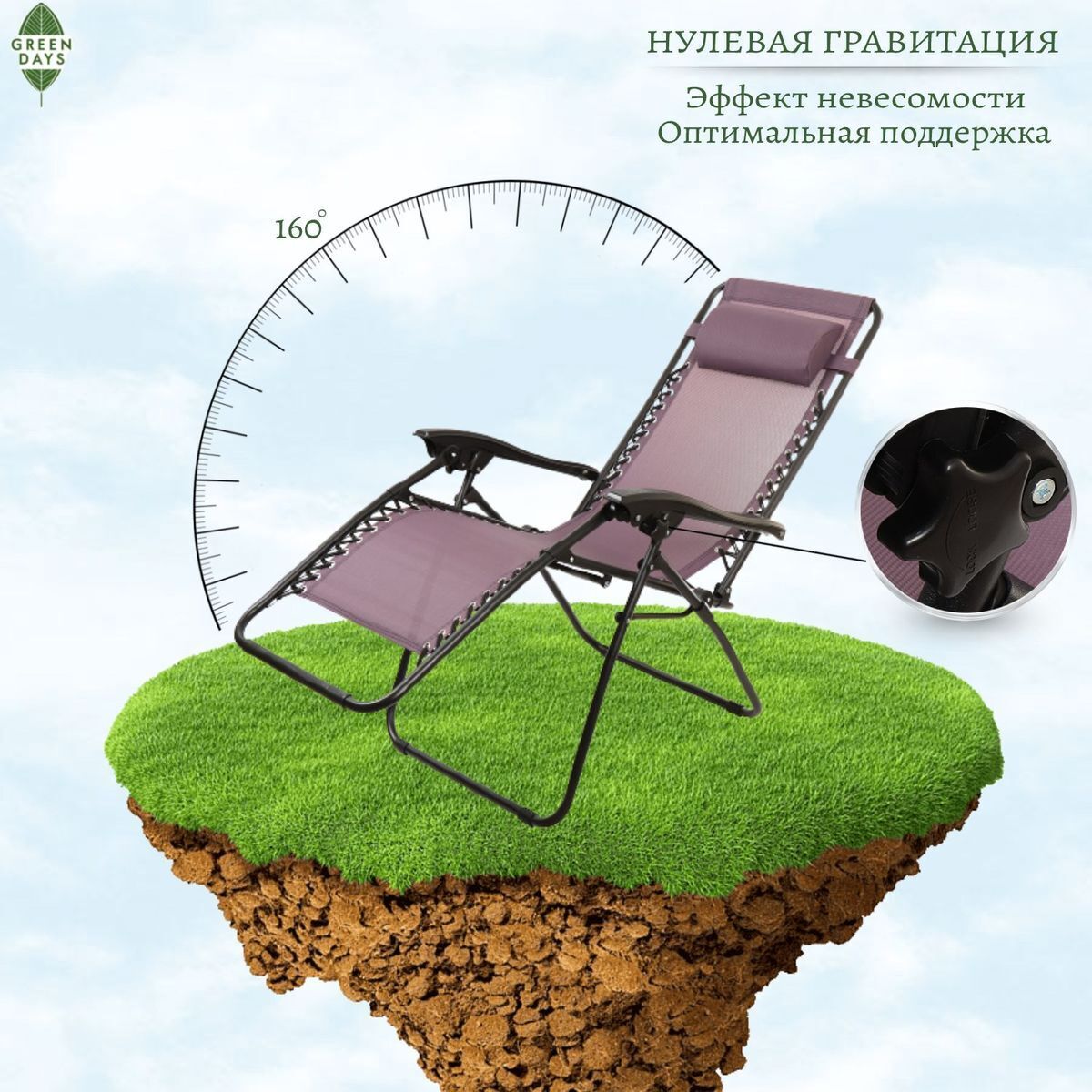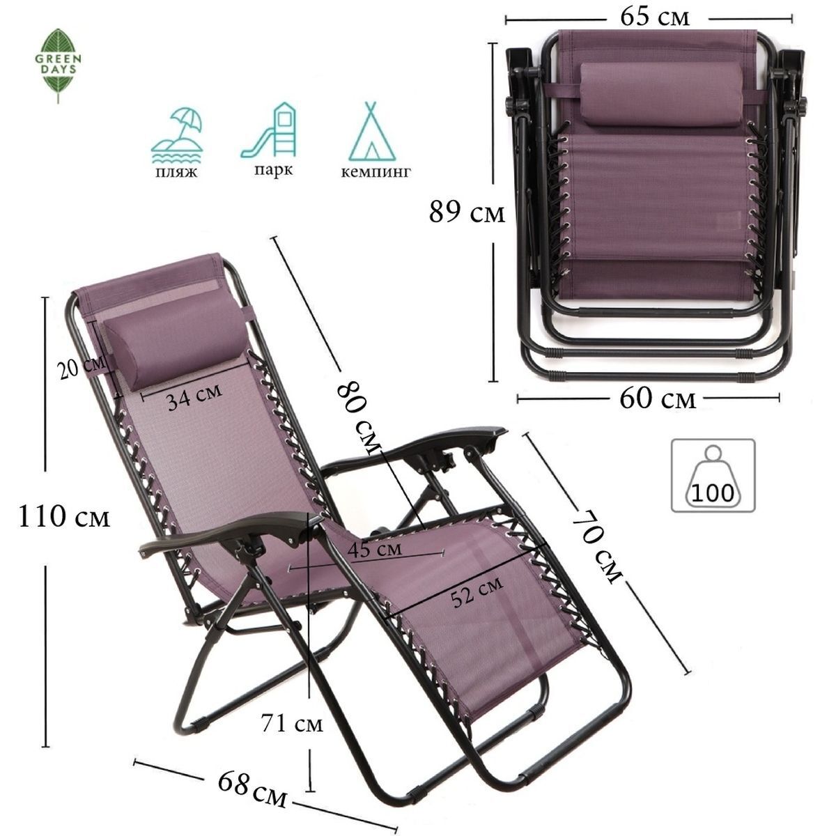 Благодаря легкой транспортировке и удобному исполнению, шезлонги Green Days идеально подойдут в качестве кресел для отдыха во дворе, кемпинга или принятия солнечных ванн на пляже. Также лежак можно использовать дома. Вес шезлонга составляет всего 7 кг.