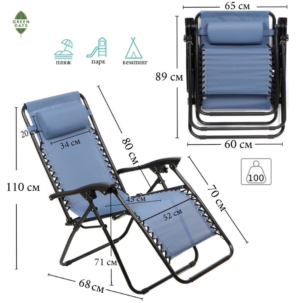 Шезлонг пляжный складной, металл, 165х65х110 см, 100 кг, 2 положения спинки, синий, Green Days