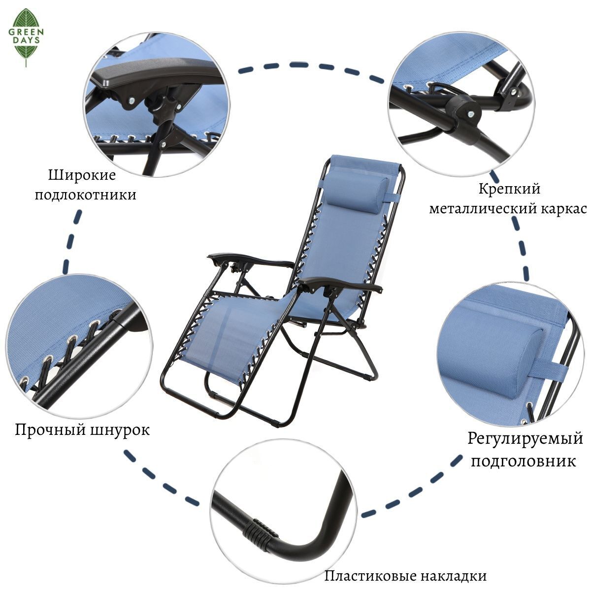 Благодаря легкой транспортировке и удобному исполнению, шезлонги Green Days идеально подойдут в качестве кресел для отдыха во дворе, кемпинга или принятия солнечных ванн на пляже. Также лежак можно использовать дома. Вес шезлонга составляет всего 7 кг.