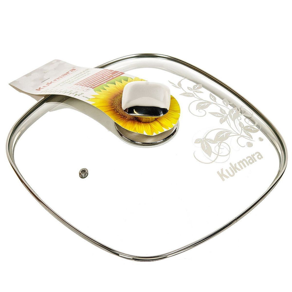 Квадратная стеклянная крышка из термостойкого стекла Kukmara с ободом и ручкой из нержавеющей стали. Предназначена для приготовления пищи как на плите, так и в жарочных или духовых шкафах.