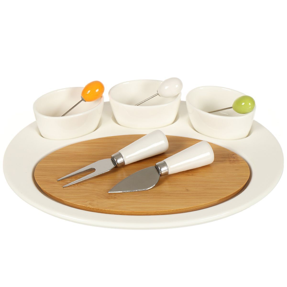 Набор сервировочный выполнен из высококачественного белого фарфора, имеет бамбуковую доску для подачи и 3 отделения для соусов, меда или других продуктов. Набор подойдет для сервировки сыра, стейков, шашлыка, рыбы, суши, роллов, конфет, пирожных, разнообразных закусок, фруктов, сладостей и другой еды. Можно использовать не только как сырный набор, но и как декоративное праздничное блюдо. Например, как пасхальное блюдо для подачи кулича. Деревянное блюдо на фарфоровой подставке сможет стать настоящим украшением стола и элементом декора кухни. Фарфоровые детали без бамбуковой доски можно использовать в СВЧ (микроволновая печь) и ПММ (посудомоечная машина). Доску нельзя замачивать. Набор поставляется в яркой картонной упаковке. Набор для сервировки сможет стать настоящим украшением вашей кухни или приятным подарком для ваших родных и близких!