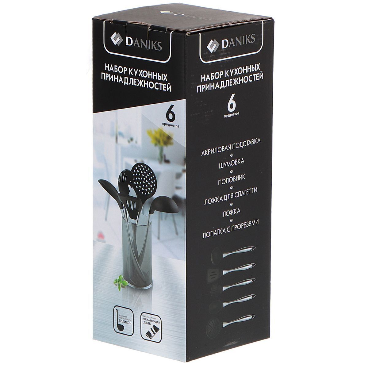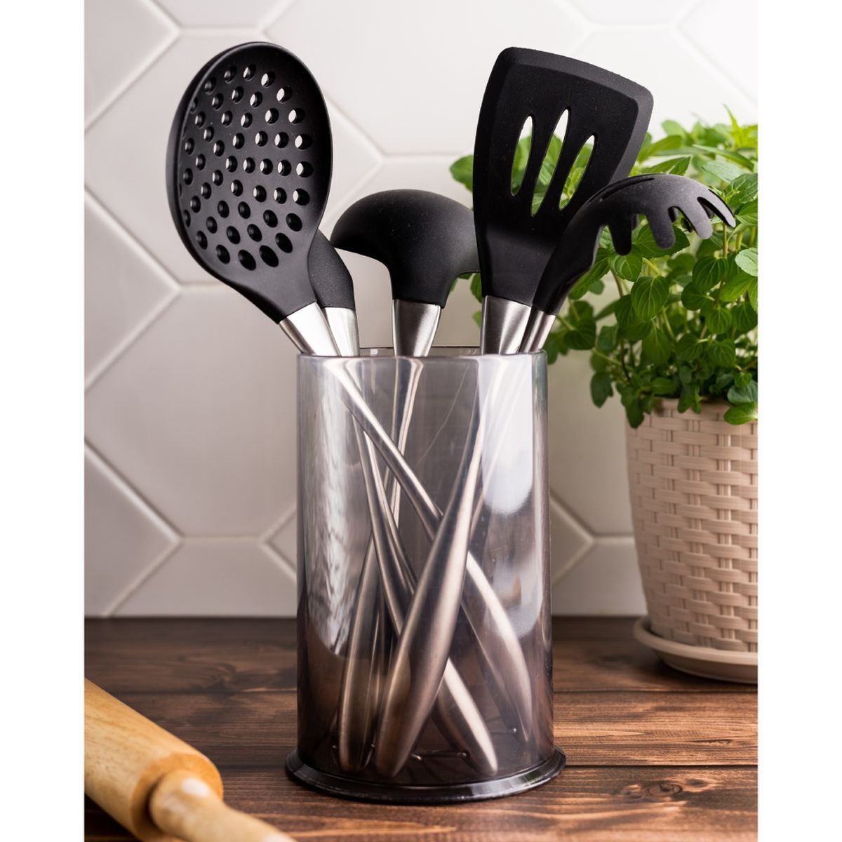 Набор кухонных принадлежностей — практичное приобретение для вашей кухни! С ним готовить любимые блюда станет намного проще и удобнее. Набор включает в себя самые востребованные кухонные принадлежности. Рабочая поверхность изделий выполнена из высококачественного силикона, а основание из прочной стали. Для хранения инструментов предусмотрена подставка-стакан.