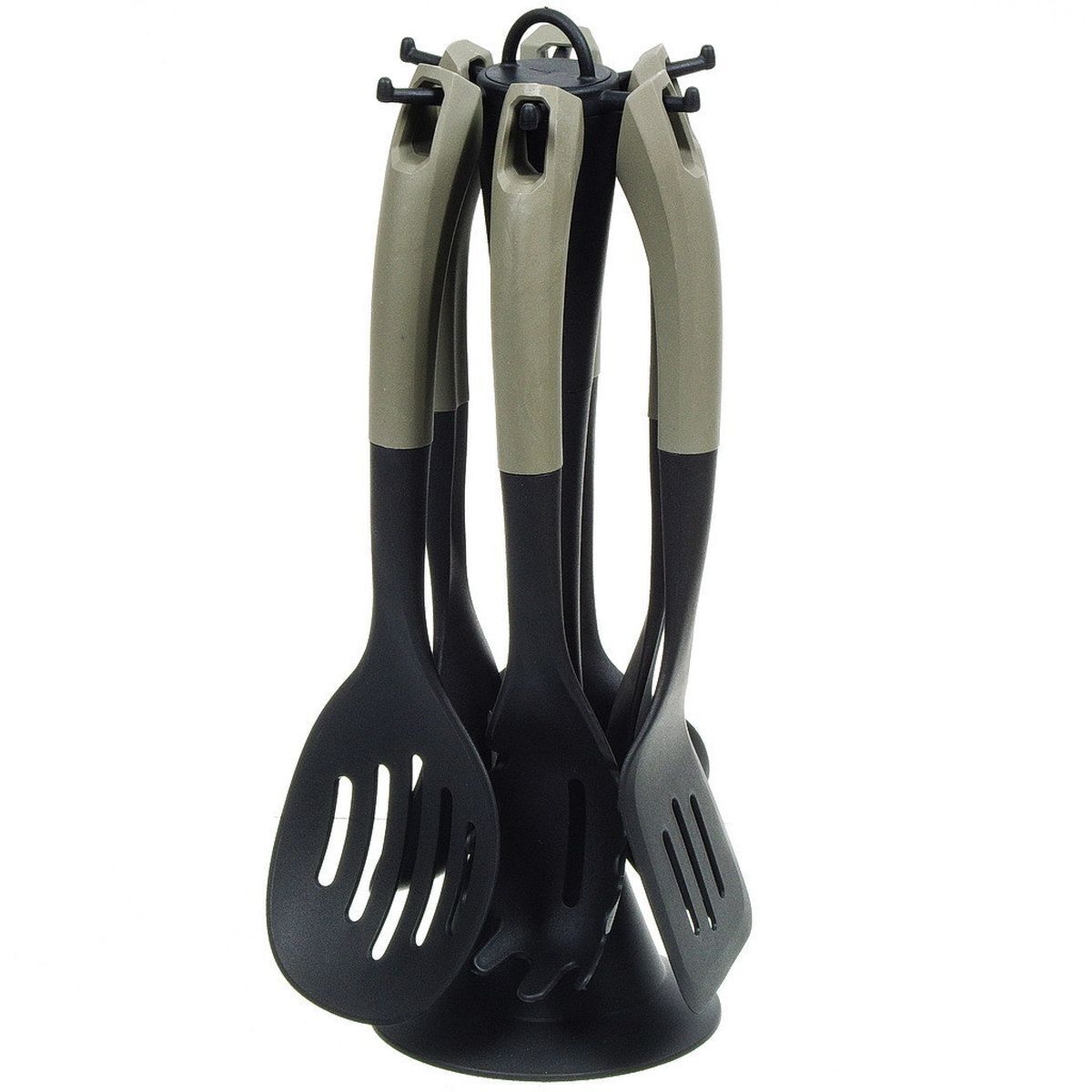 Набор кухонных принадлежностей — практичное приобретение для вашей кухни! С ним готовить любимые блюда станет намного проще и удобнее. Набор включает в себя самые востребованные кухонные принадлежности: половник, лопатку с прорезями, шумовку, картофелемялку, ложку поварскую, лопатку. Рабочая поверхность изделий выполнена из высококачественного нейлона, а основание из прочной стали. Для хранения инструментов предусмотрена подставка с крючками.