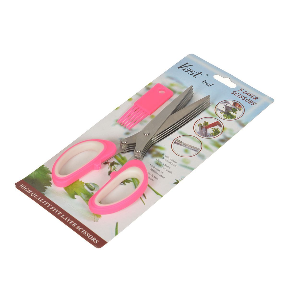 Ножницы для зелени - полезная вещь на кухне, в особенности для тех, кто любит готовить блюда с зеленью или для тех, кто собирается делать запасы и их замораживать. Данный кухонный девайс значительно ускорит время нарезания зелени. Данная модель кухонных ножниц снабжена пятью уровнями лезвий. Также в комплект входит небольшое приспособление для их очистки.