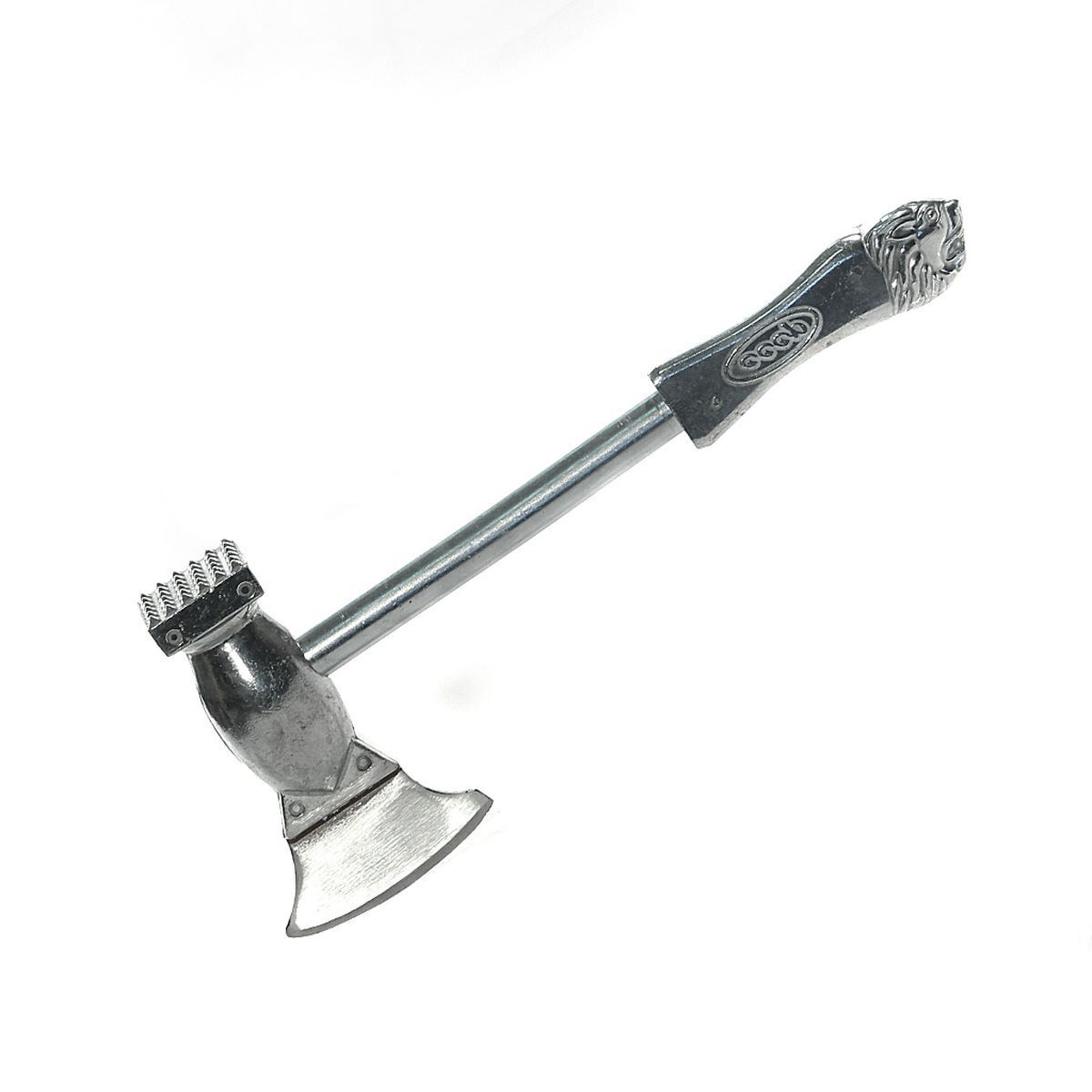 Молоток для мяса с топориком выполнен из из алюминиевого сплава. Рукоятка с красивым анималистическим изображением имеет дополнительный вес для баланса.