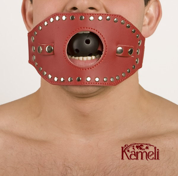 Кляп от Kameli, из натуральной кожи, закрывающий пол-лица, с металлическими заклёпками и твёрдым шаром, диаметр которого 5 см. Плашка к кляпом со стороны лица имеет размеры 9 на 21 см. Застёжка - регулируемая металлическая пряжка. Обхват головы от 48 до 62 см.