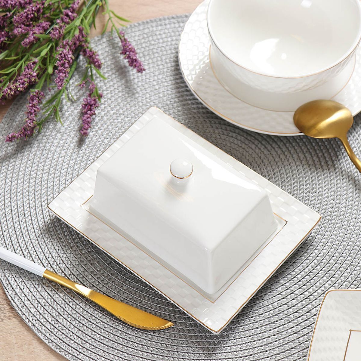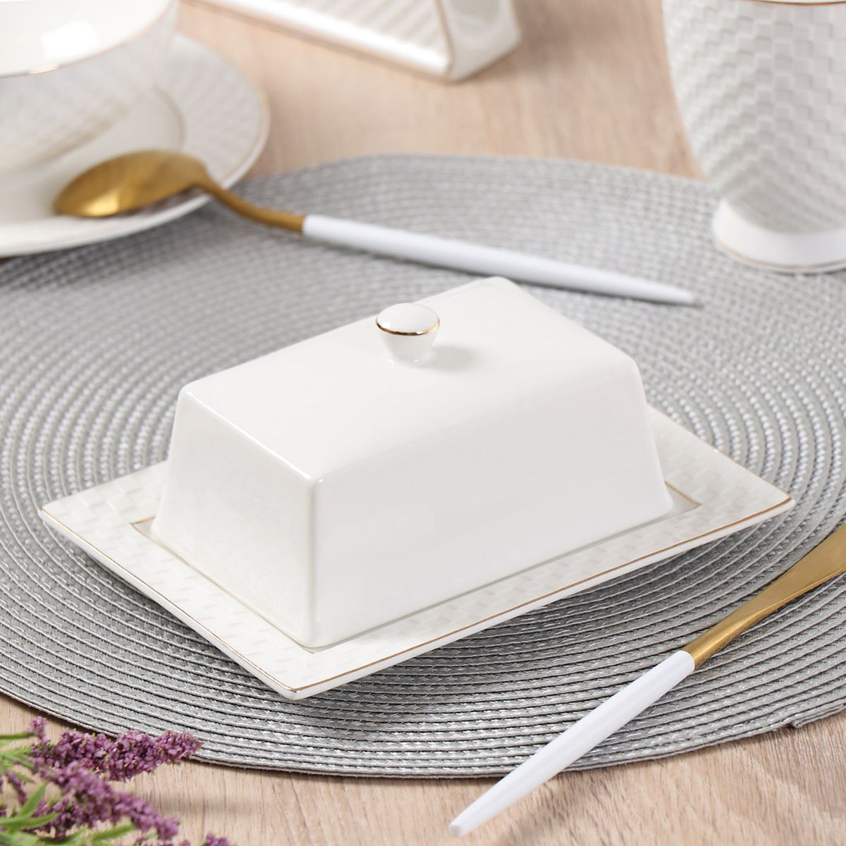 Масленка из коллекции "Кембридж" идеально впишется в интерьер любой кухни. Благодаря ей масло сохранит свой натуральный вкус и свежесть, оно будет надежно защищено от влияния посторонних запахов и обветривания. Рельефное украшение и золотистая вставка делает ее утонченным и изысканным, а потому можно смело рассматривать ее в качестве практичного и изысканного презента.
