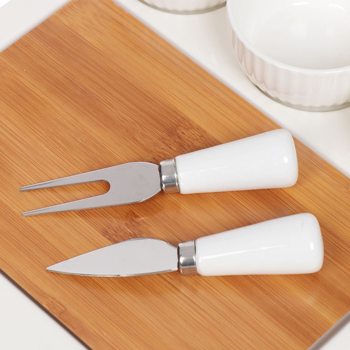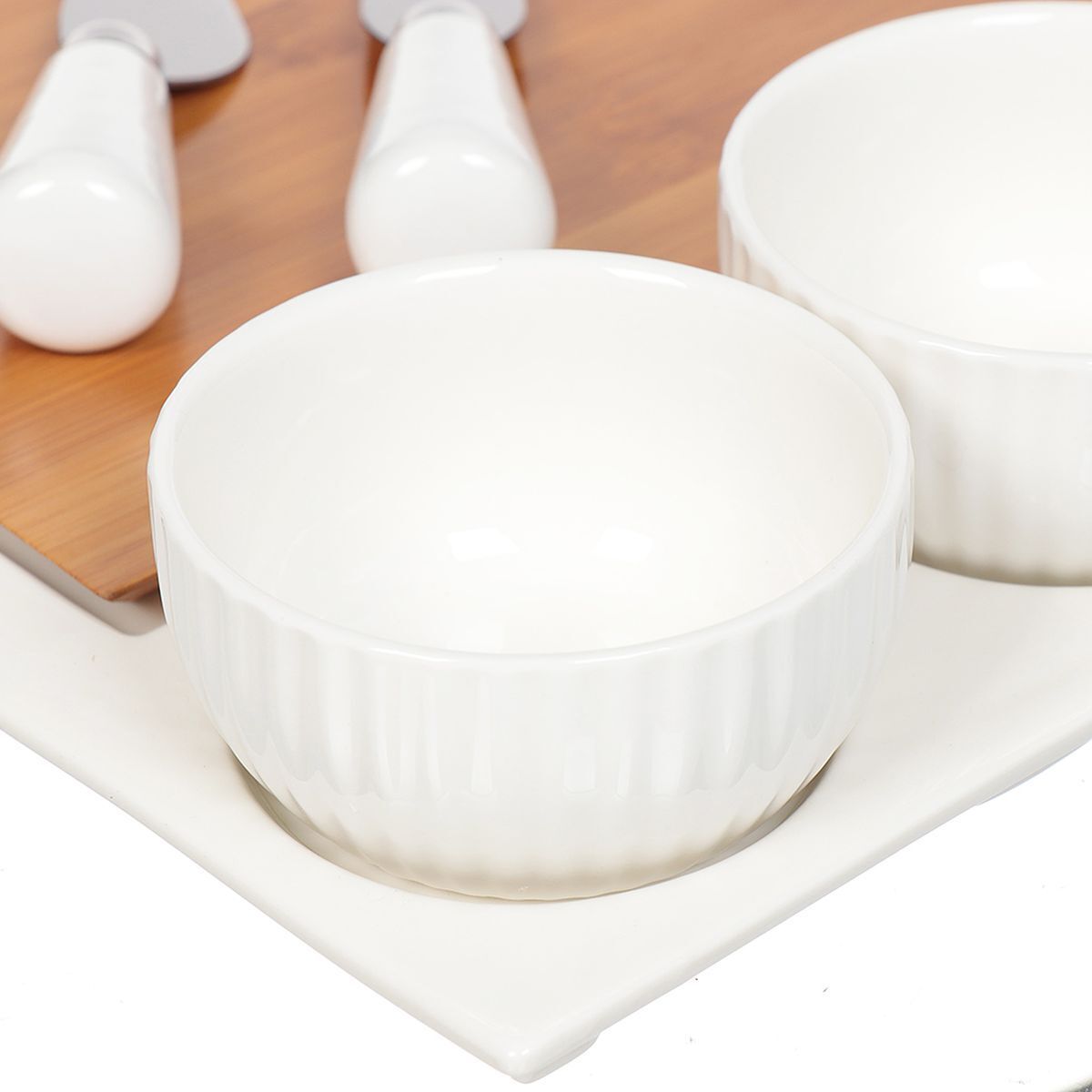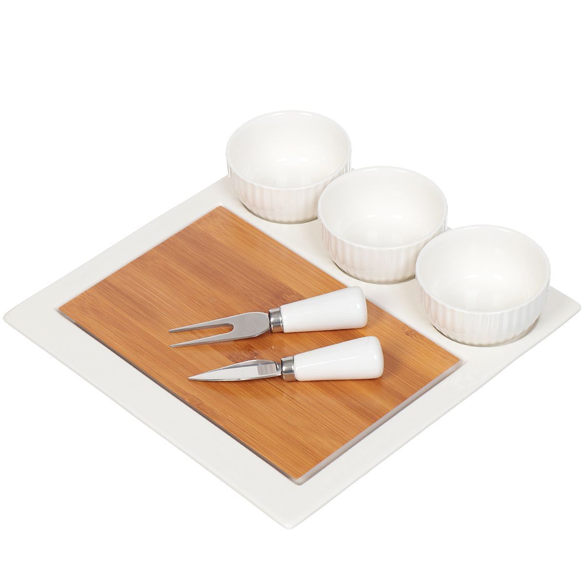 Набор для сервировки выполнен из высококачественных материалов и состоит из 6 предметов — подноса, разделочной доски из бамбука, фарфоровых соусников и столовых приборов. Набор для сервировки прекрасно подходит для подачи сыра и фруктов и благодаря необычному дизайну украсит любой стол. Разделочная доска легко снимается и моется, а в соусниках удобно и эстетично сервировать мед и соусы к сыру.