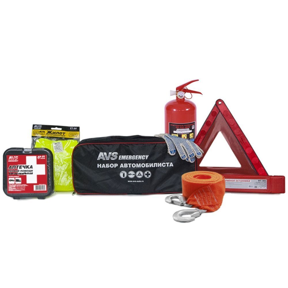 Автомобильный набор AVS Emergency в комплекте необходимые каждому автомобилисту принадлежности. В комплект включены средства первой необходимости: жилет светоотражающий, аптечка первой помощи автомобильная, знак аварийной остановки, трос буксировочный с крюками, перчатки ХБ с ПВХ, сумка "Набор автомобилиста", огнетушитель.