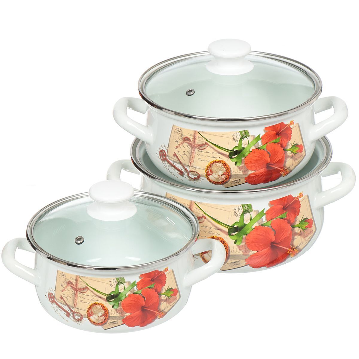 Состав набора (объем, высота/диаметр): кастрюля с крышкой 1,5 л, 8х18 см, кастрюля с крышкой 2 л, 9х20.5 см, кастрюля с крышкой 3 л, 11х22.5 см