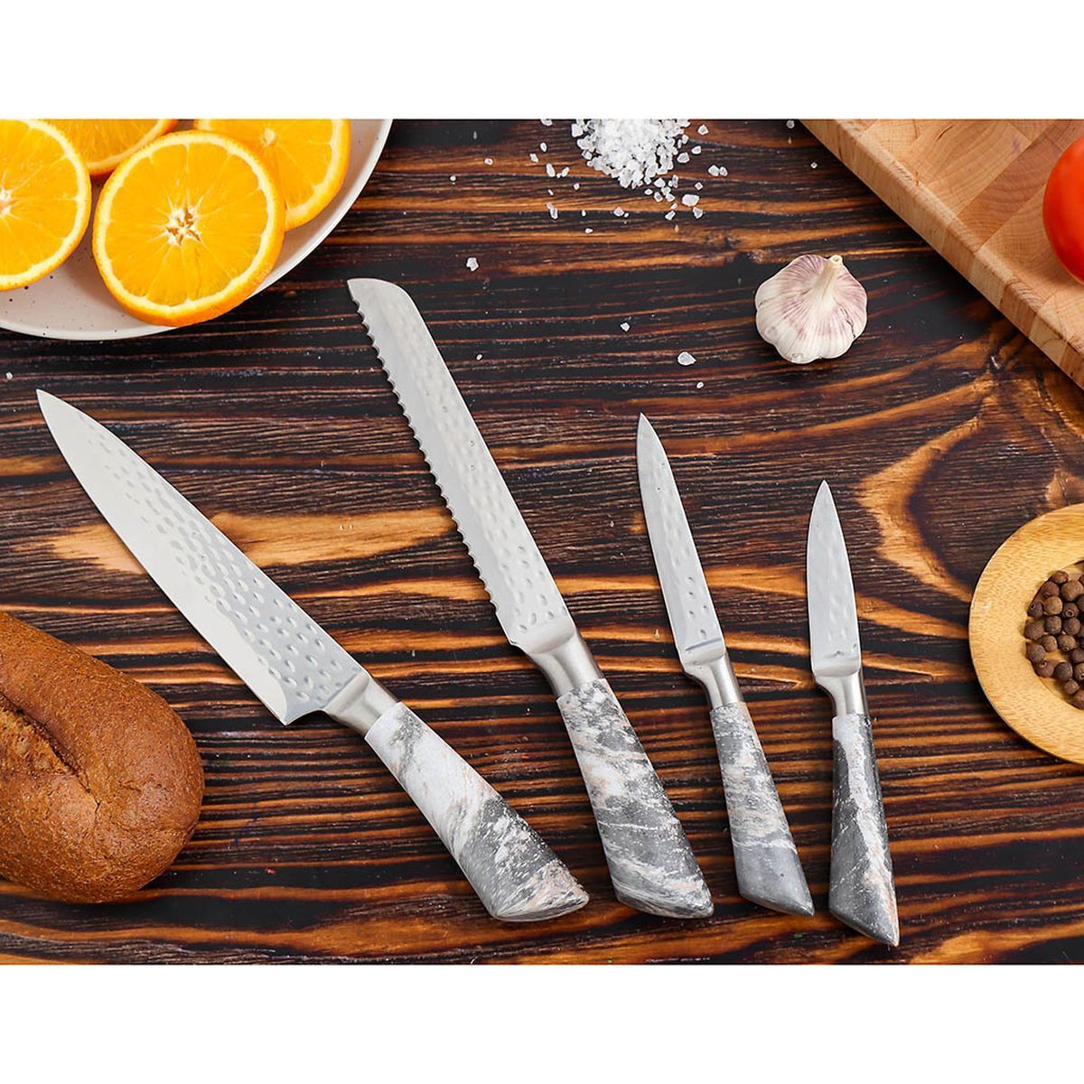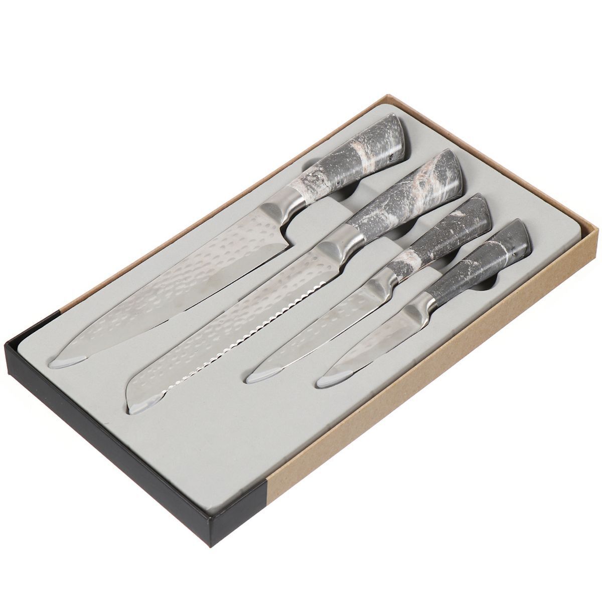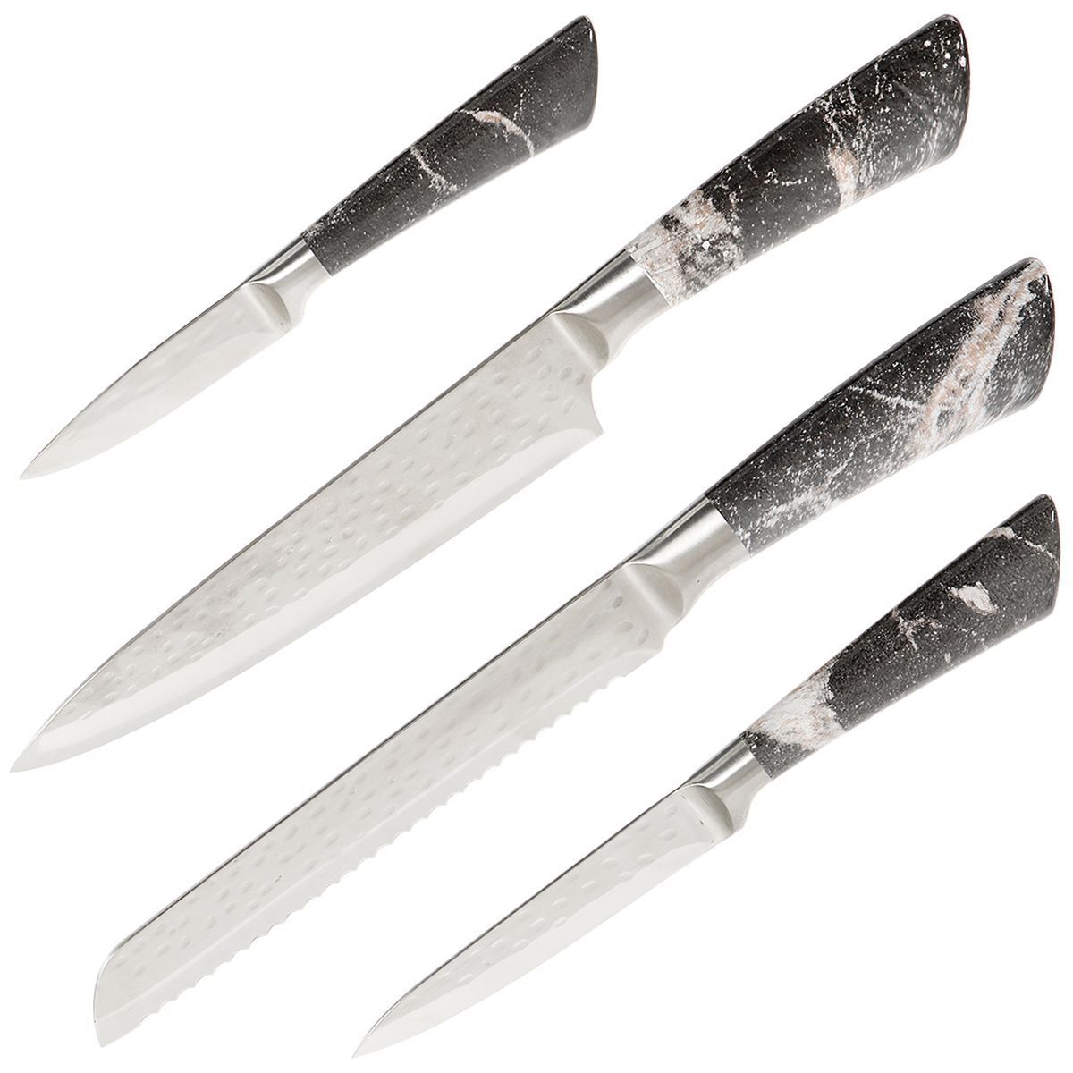 Набор включает 4 ножа. Лезвия изготовлены из высококачественной нержавеющей стали, которая отличается долговечностью, легкостью заточки и устойчивостью к коррозии. Лезвия ножей долго остаются острыми.