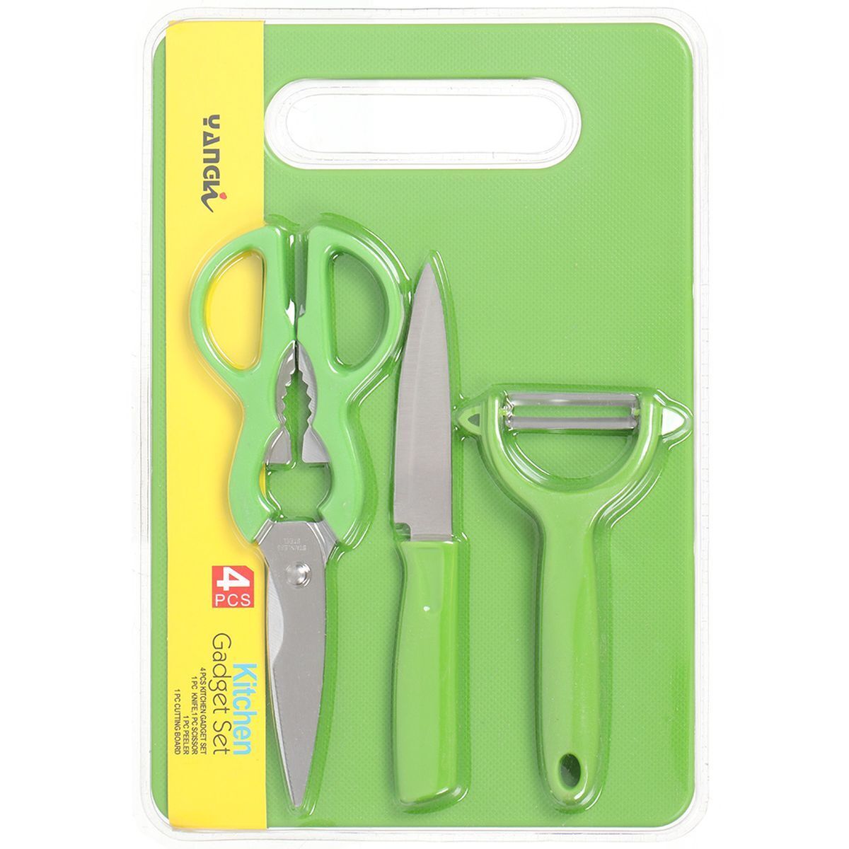 Набор включает 4 предмета: нож, овощечистка, ножницы, доска. Универсальный набор для любой кухни, в котором есть все необходимое.