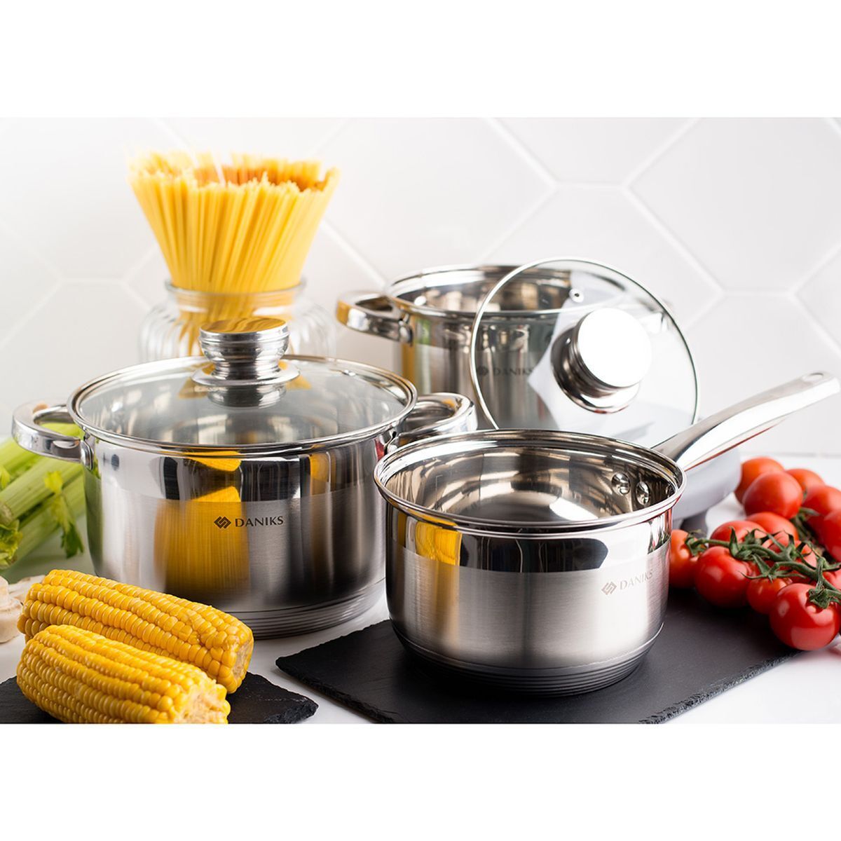 Набор посуды Daniks Стандарт SD-6-2 выполнен из высококачественной нержавеющей стали. Крышки из прозрачного стекла позволяют контролировать процесс приготовления пищи. Металлические ручки удобны, прочны и не нагреваются при использовании посуды.