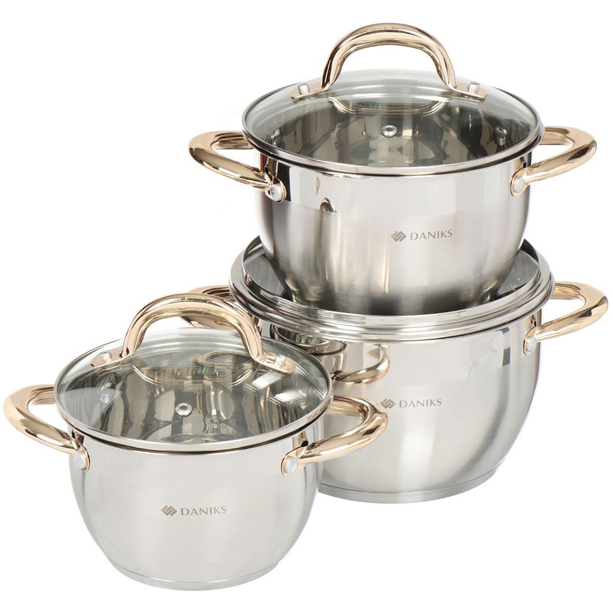 «Набор посуды нержавеющая сталь, 6 предметов, кастрюли 2,2.9,3.9 л, индукция, Daniks, Мадрид Gold, SD-331G» можно купить мелким, средним и крупным оптом по привлекательным ценам благодаря тому, что мы сотрудничаем с российскими и международными производителями напрямую, без посредников.