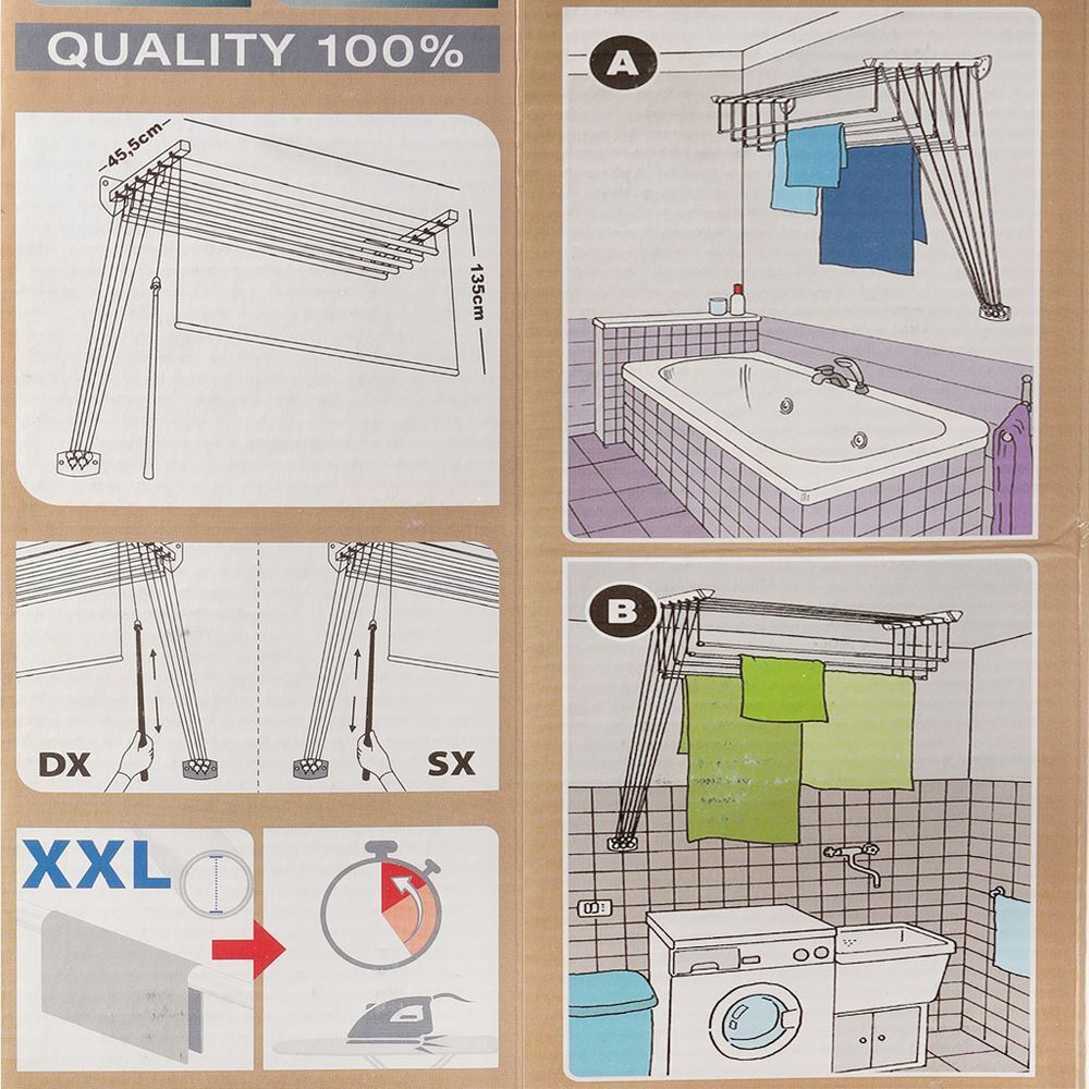 Cушилка Gimi "Lift 160" представляет собой пластиковые стержни, закрепленные при помощи направляющих шнуров на стальных кронштейнах, которые в свою очередь крепятся на стене или потолке. Специальный механизм обеспечивает подъем и опускание стержней, что значительно облегчает процесс развешивания белья. Стержни сушилки, на которые развешивается белье, устанавливаются до нужного для вас уровня, в зависимости от вашего роста. Сушилку можно установить в любом удобном для вас месте квартиры или балкона. Лучший вариант для сушки громоздкого белья, не занимая лишнего места в комнате.