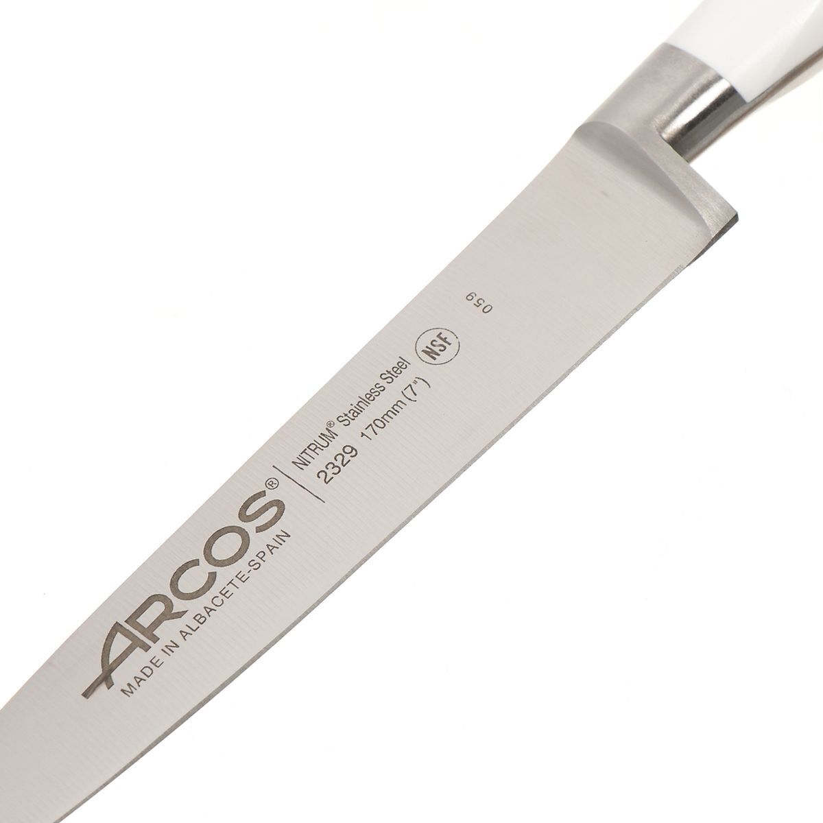 Ножи оснащены клинками из кованой высоколегированной стали X45 CrMoV15 Nitrum и рукоятьми из белого полиоксиметилена. Также каждое изделие из данной линейки оснащено больстером из полированной нержавеющей стали. Клинки острого инвентаря Arcos имеют двухстороннюю (симметричную) заточку под 20 градусов. Твердость режущей кромки составляет 53-56 HRC (легко правится с помощью мусата и длительное время держит остроту).