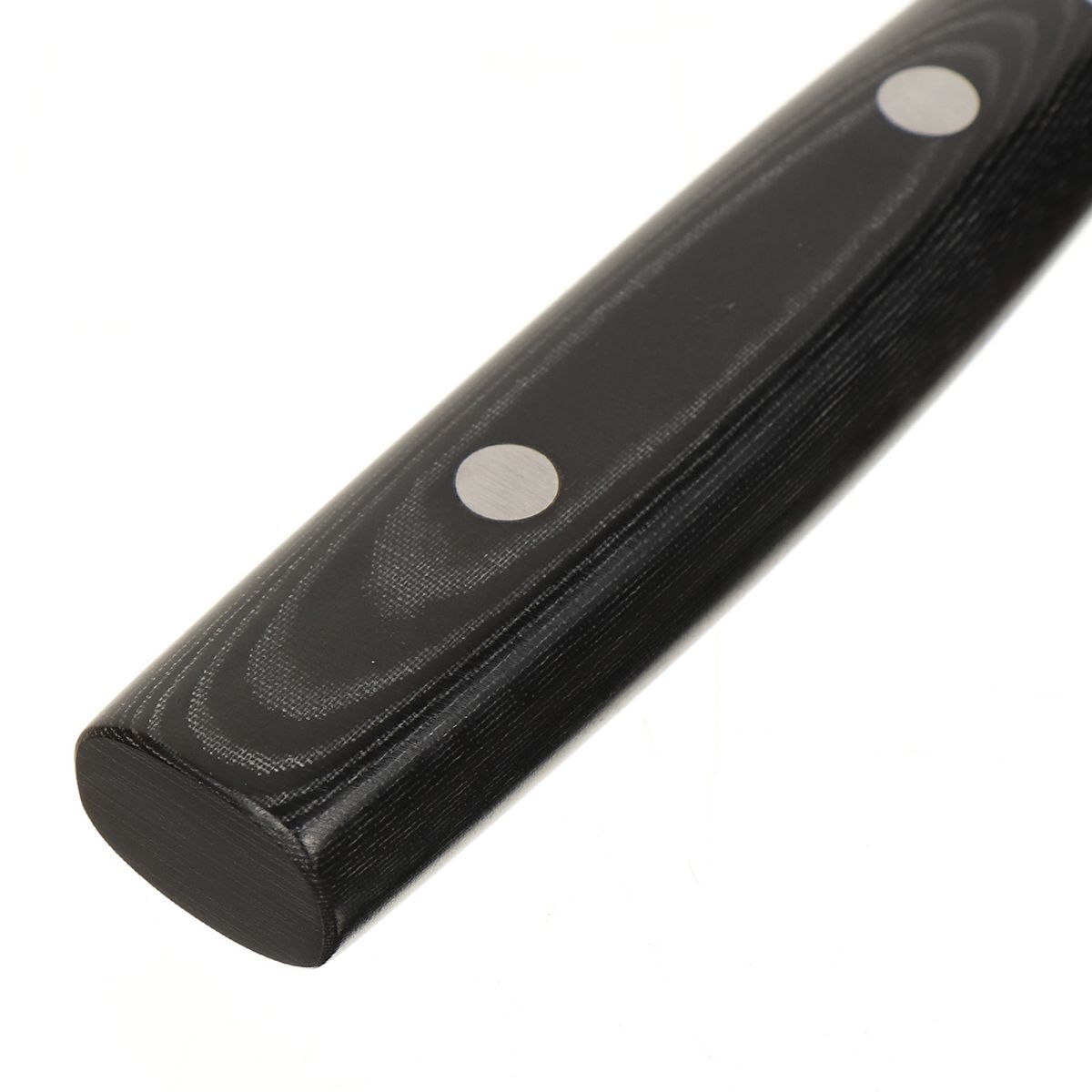 Рукоять изготовленна из микарты черного цвета (долговечного композита, в состав которого входит смола и льняные волокна). Такая рукоятка не только никогда не скользят, но и отвечают самым высоким гигиеническим требованиям. Форма рукояти прямая, округлая в разрезе, с легким утолщением в средней части, очень удобно ложится в ладонь любого размера.
