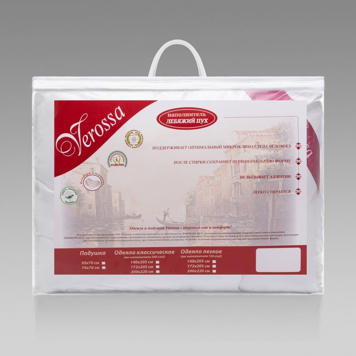 Облегченное спальное одеяло; наполнитель-полиэстер 100%; ткань верха - пуходержащий перкаль, 100% хлопок. Одеяла и подушки Verossa с имитацией лебяжьего пуха сочетают в себе достоинства натуральных материалов с преимуществами синтетических: они созданы, чтобы дарить Вам идеальный комфорт во время сна. Легкое одеяло с заменителем лебяжьего пуха мягкое, пышное и воздушное; обладает бактерицидными свойствами, высокой воздухопроницаемостью и не теряет форму благодаря вшитому атласному канту. Ткань перкаль из 100% хлопка очень прочная и износостойкая; приятна на ощупь, легко стирается и не нуждается в специальном уходе, предотвращает перемещение наполнителя внутри изделия.Одеяло с заменителем пуха не скатывается, препятствует размножению грибка и вредоносных микроорганизмов, остается легким и пушистым долгие годы. Тщательно подобранная толщина создаст великолепные условия для отдыха в жаркую погоду.