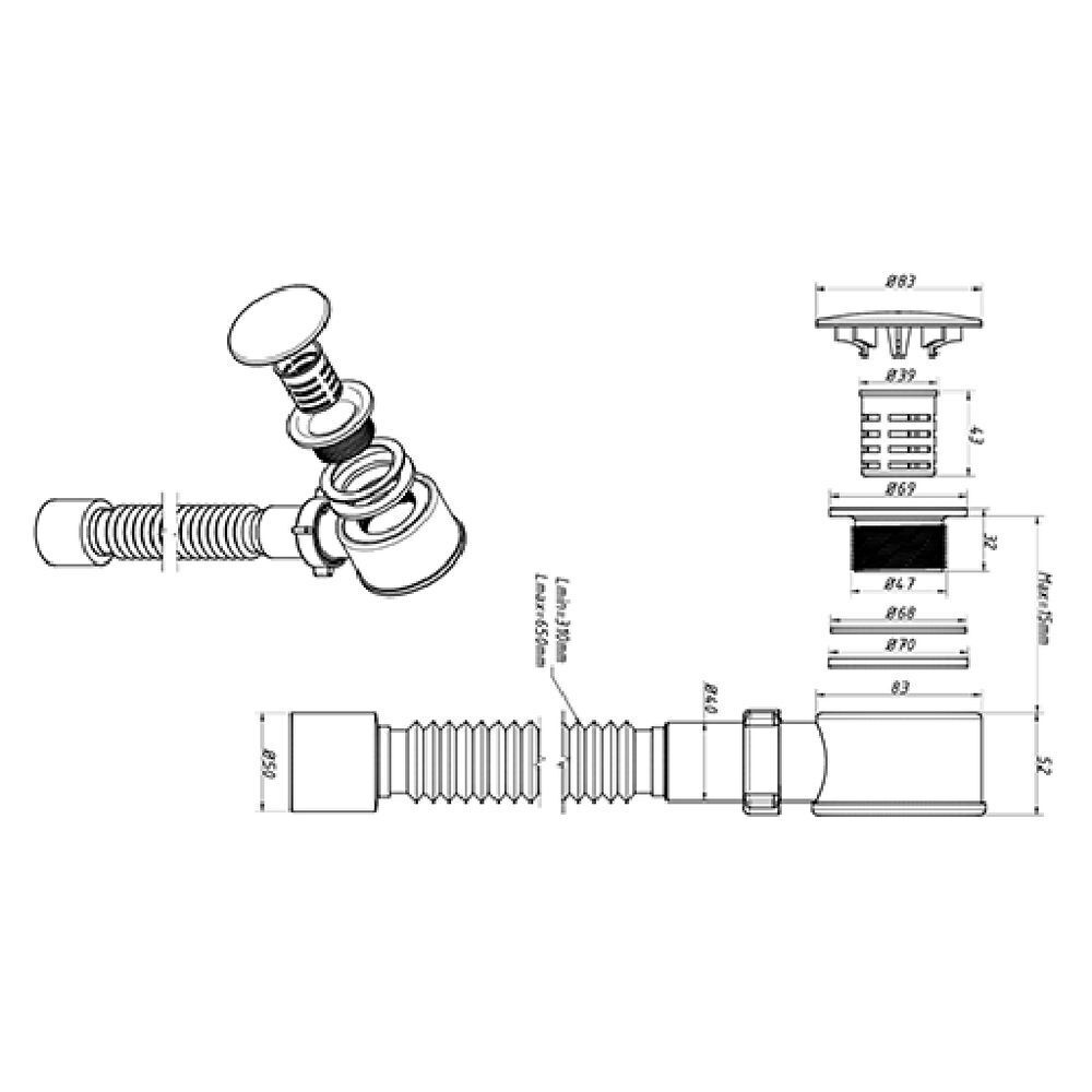 Низкий сифон для душевого поддона с отверстием для слива 50 мм. Габаритная высота сифона - 52 мм. Отвод в канализацию гибкая труба 1 1/2" х 50.