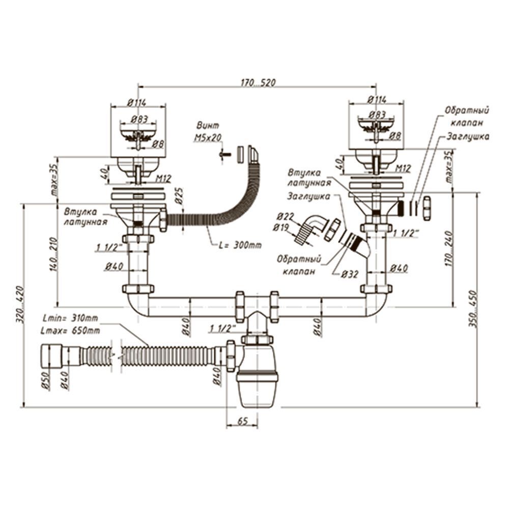 регулировка по высоте сифона: 350-450 мм