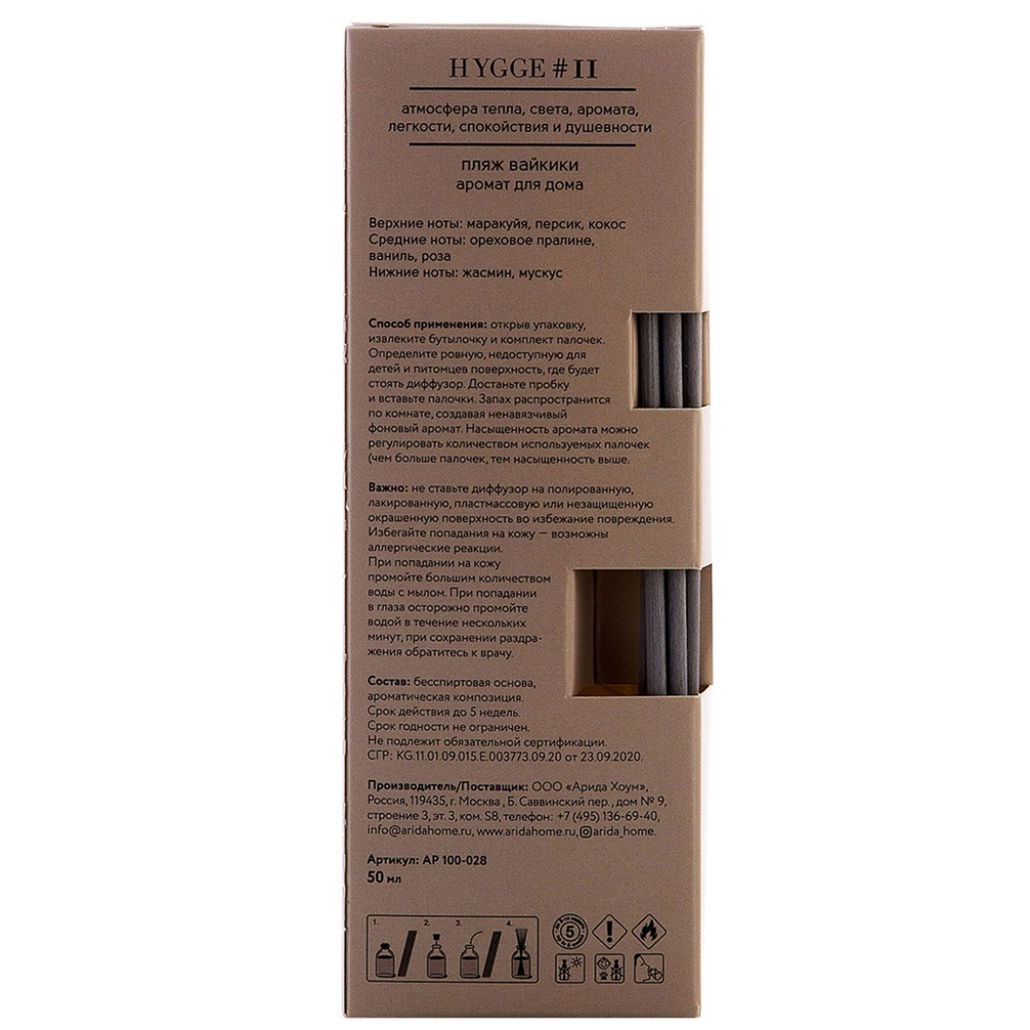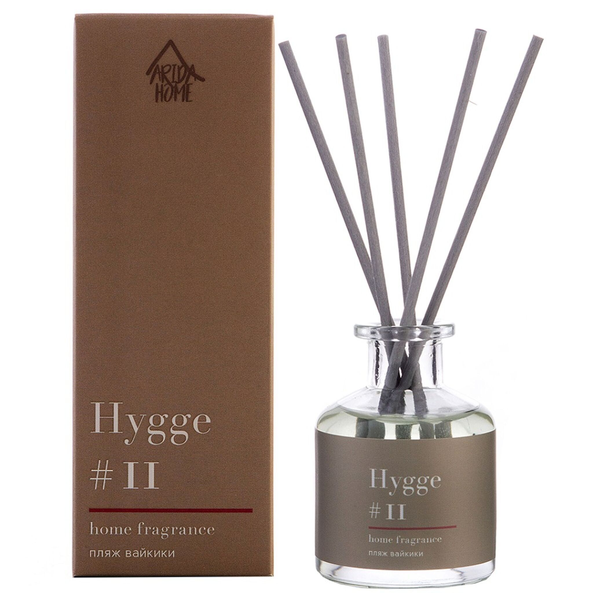 Аромадиффузор с палочками Arida Home Hygge #11 Пляж Вайкики — это безопасный экологически чистый и натуральный способ ароматизации помещения, является прекрасной альтернативой ароматизированным спреям. Стильный дизайн этого модного ароматического аксессуара украсит любой интерьер. Диффузор представляет собою изящную стеклянную емкость с ароматной жидкостью. В нее вставляются несколько длинных фибровых палочек. Постепенно, насыщаясь эфирными маслами, они распространяют аромат по всей комнате. Палочки важно применять сразу все и периодически переворачивать (1–2 раза в сутки). Флакона объемом 50 мл хватит на помещение площадью до 15 кв.м. Срок службы диффузора от 1,5 до 2 -х месяцев, в зависимости от места использования. В более влажных помещениях срок использования сокращается.