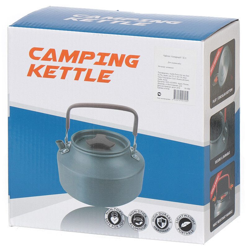 Легкий походный чайник из алюминия объемом 1,6 литра. Может использоваться на костре или горелке. Материал: анодированный алюминий